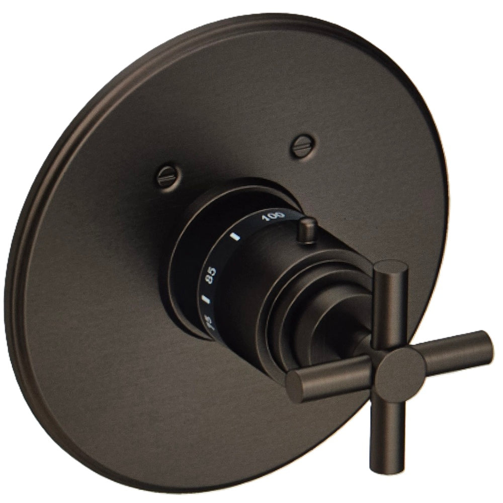 The Newport Brass 3-994TR/07 is a 3/4-inch round thermostatic shower trim plate and handle from the East Linear collection, featuring an English Bronze finish. This product is designed for precise temperature control in the shower and requires a specific, separate rough-in valve.