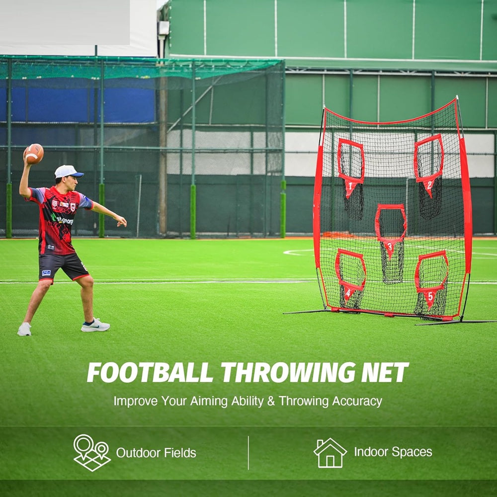 The Sport Nets Football Throwing Training Net with 5 Target Pockets Red 7' x 7' is a spacious net with 5 strategically placed 13" x 13" target pockets is the perfect training aid for quarterbacks of all ages. Features a heavy-duty steel base, reinforced fiberglass side poles, and resilient 7-ply netting, ensuring long-lasting performance. Lightweight and easy to assemble, this...