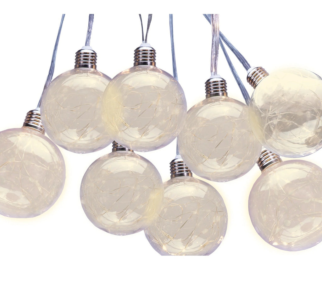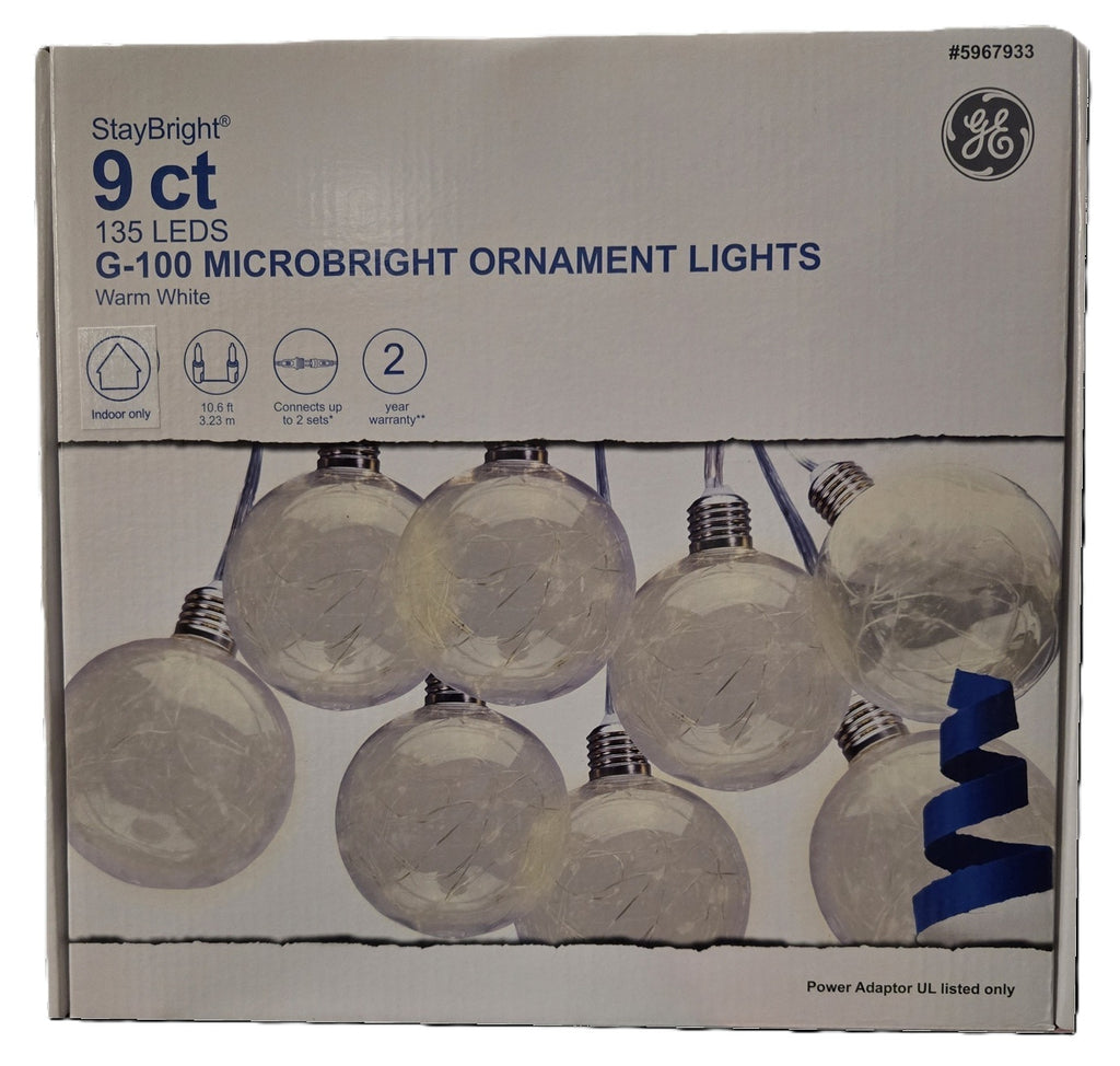 Decorate for the holidays with the GE 9-count StayBright G-100 Microbright Ornament 135 LED Warm White String Lights. GE StayBright LED 9-CT G100 MicroBright light set with 135 Warm White LEDs. 15-Lights per Warm White Balls. 24-Inch lead wire, 16-inch spacing, 4-inch end connector, 10.6-feet lighted length, transparent cord set. Connect up to 2 sets. Indoor use only. Warm White...