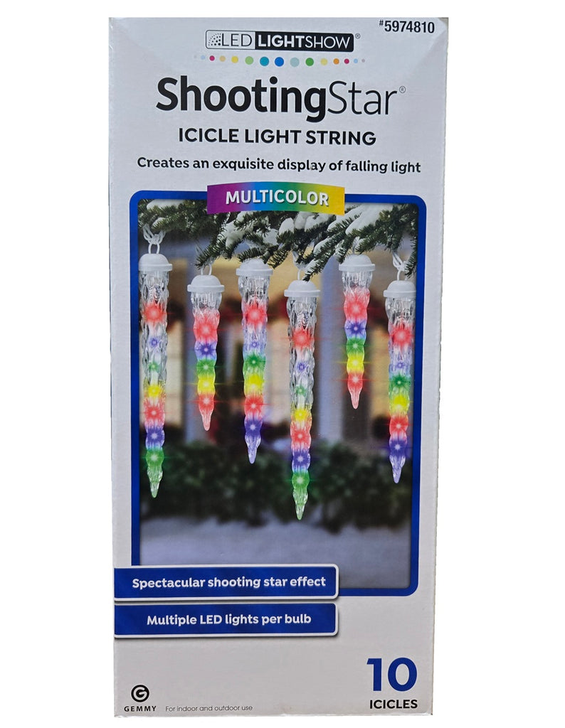 Put on a dazzling display this holiday season with a Gemmy LightShow ShootingStar 10-Count LED Multicolor Icicle Light String! Featuring 10-count multicolor LED bulbs in graduated sizes (11", 7", 9"), this Christmas light string displays a spectacular shooting star effect. It's perfect for outdoor holiday decorating along rooflines, in trees or anywhere you enjoy Christmas lights. Includes bright, energy-efficient LED...