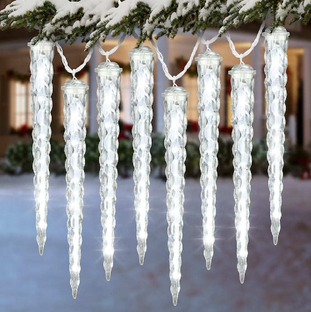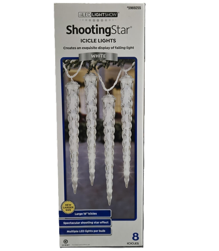 Put on a dazzling display this holiday season with a Shooting Star icicle light string! Featuring 8 LED LightShow ShootingStar Icicle Lights bulbs 16-inch, this Christmas light string displays a spectacular shooting star effect in bright white. It's perfect for outdoor holiday decorating along rooflines, in trees or anywhere you enjoy Christmas lights. Includes bright, energy-efficient LED lights. Features: Set...