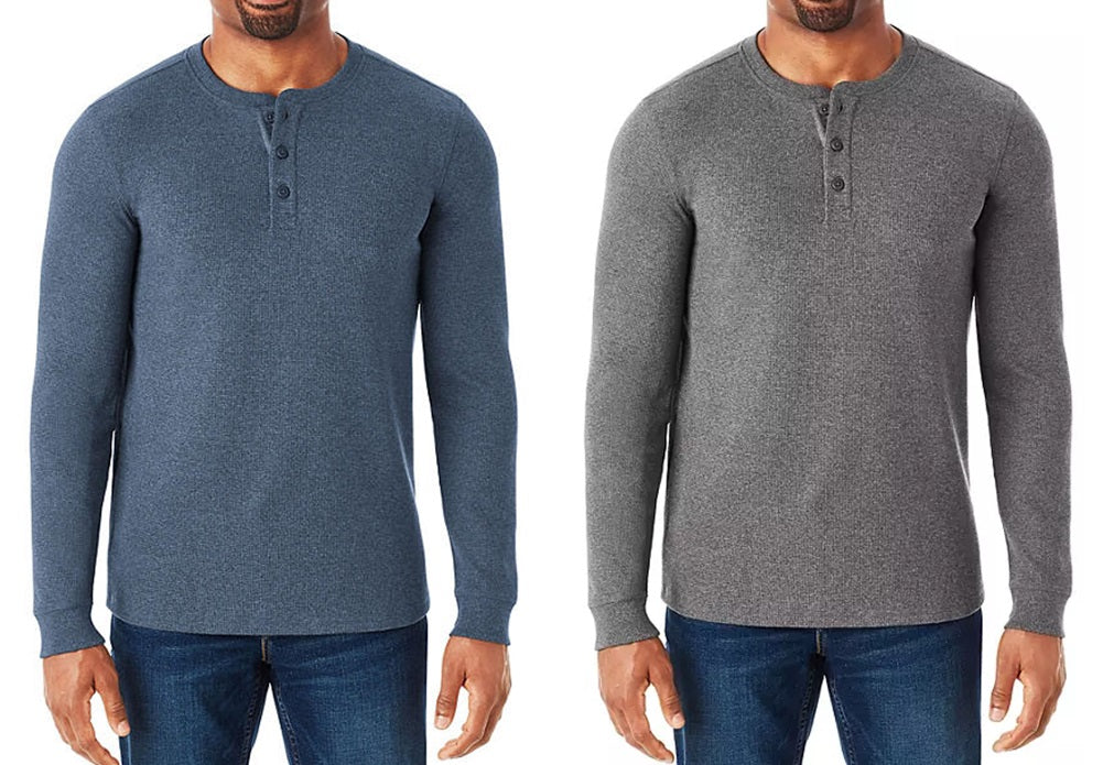 The Member's Mark Men's Long Sleeve XX-LARGE Thermal Henley Blue/Grey 2-Pack is the epitome of versatility, seamlessly transitioning through seasonal changes with style and ease. This long sleeve tee boasts a 3-button Henley neckline with a chambray placket that adds a touch of elevated charm. Crafted from a Cotton, Recycle Polyester, Spandex blend, the thermal waffle fabric feels heavenly and...