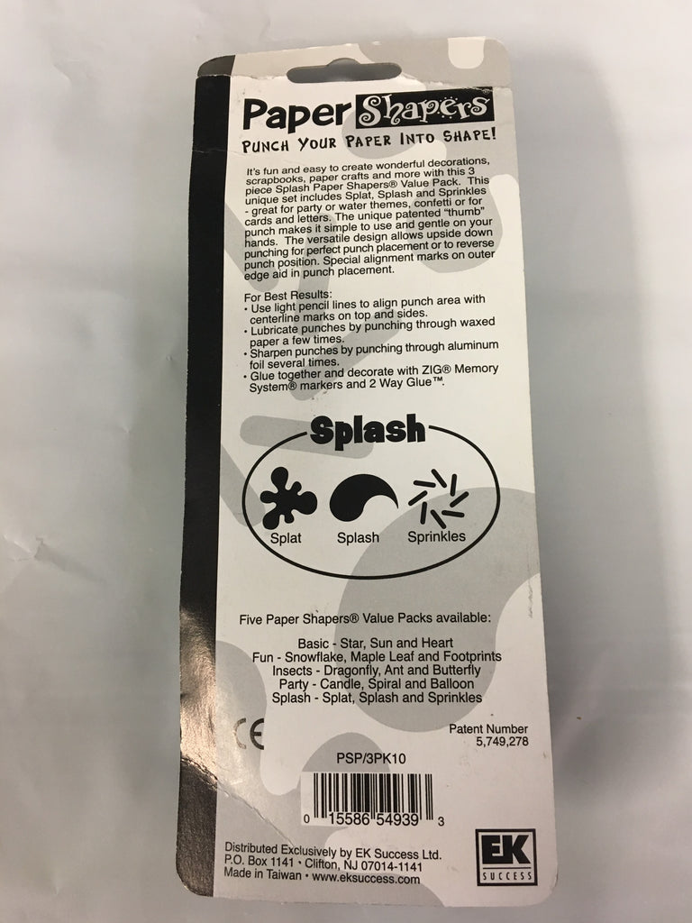 Make those scrapbook pages pop with the EK Success Paper Shapers 3 Piece Punch Set SPLASH. This unique 3 piece set includes Splat, Splash and Sprinkles - great for party or water themes, confetti or for cards and letters. The unique patented thumb punch makes it simple to use and gentle on your hands. The versatile design allows upside down...