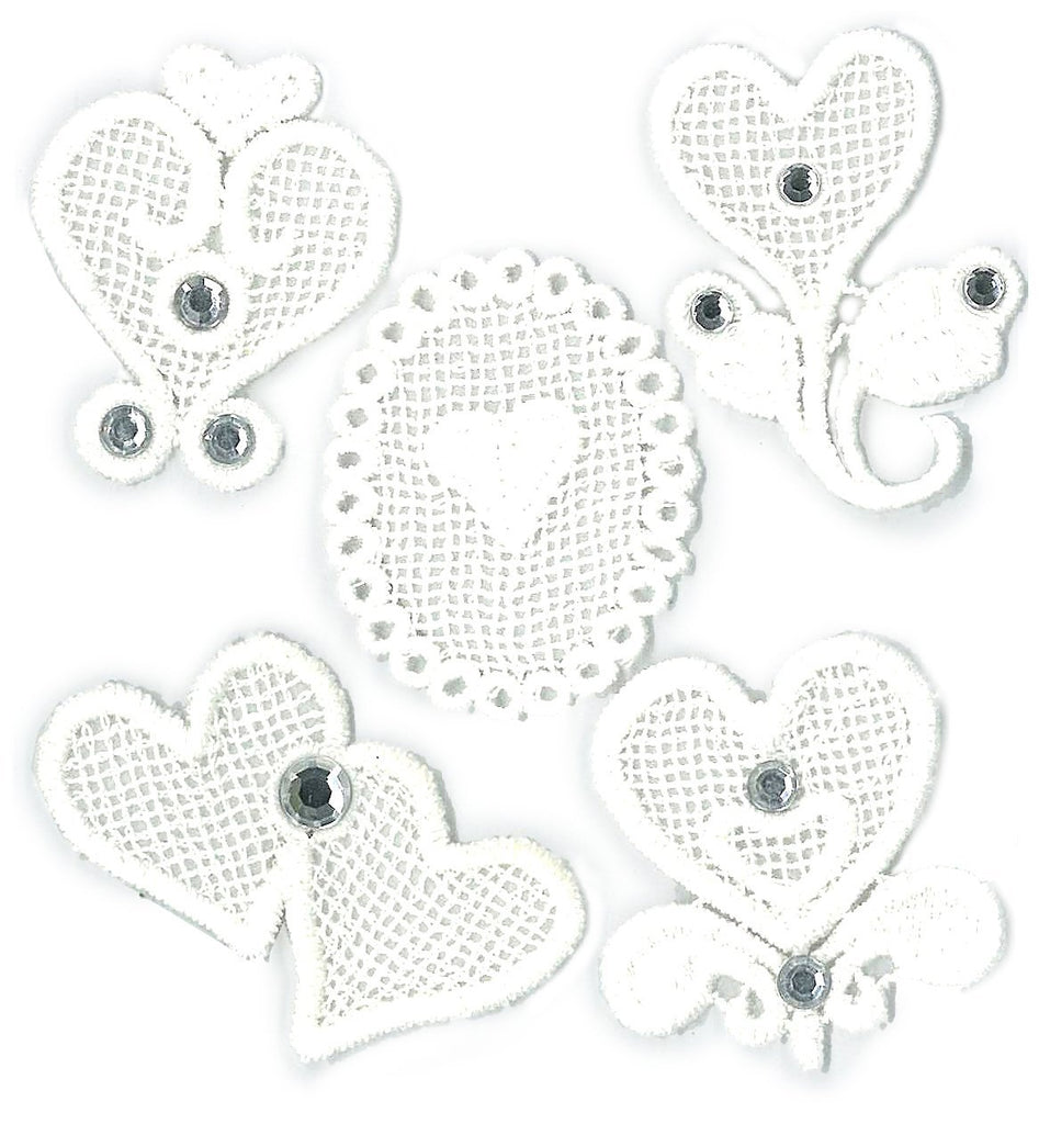 From the Jolee's Boutique Parcel Collection, these Embroidered Hearts dimensional embellishments are accented with rhinestones. Use them to accent Valentine's Day cards, scrapbook pages and more. Self adhesive. Includes 5 pieces, sticker sheet size 4-inch by 4-1/2-inch.