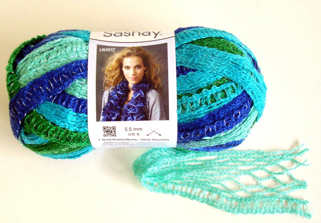 RED HEART-Sashay Sparkle. A new twist on Sashay. The holes are a little large which give it extra drape and the metallic edge has been amped up the finished scarf has an extra kick of sparkle. Weight category: 6 87-percent acrylic and 13-percent metallic 3.5oz/100g 35yd/32m. Gauge: 8st x 11r =4in/10cm on size US9 knitting needles. Suggested crochet hook size...