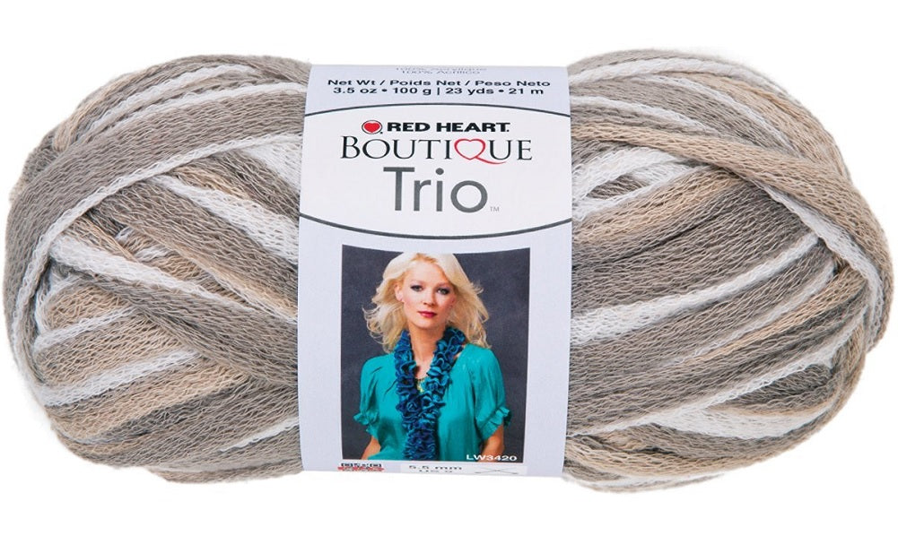 RED HEART-Boutique Trio Yarn. Trio is a unique ruffle yarn that you can stitch three ways for three different looks. Trio has three layers each a different colors. You choose the one you stitch into and the other layers will show more prominently. The neon shades have two layers of black and one layer of color so you get just...