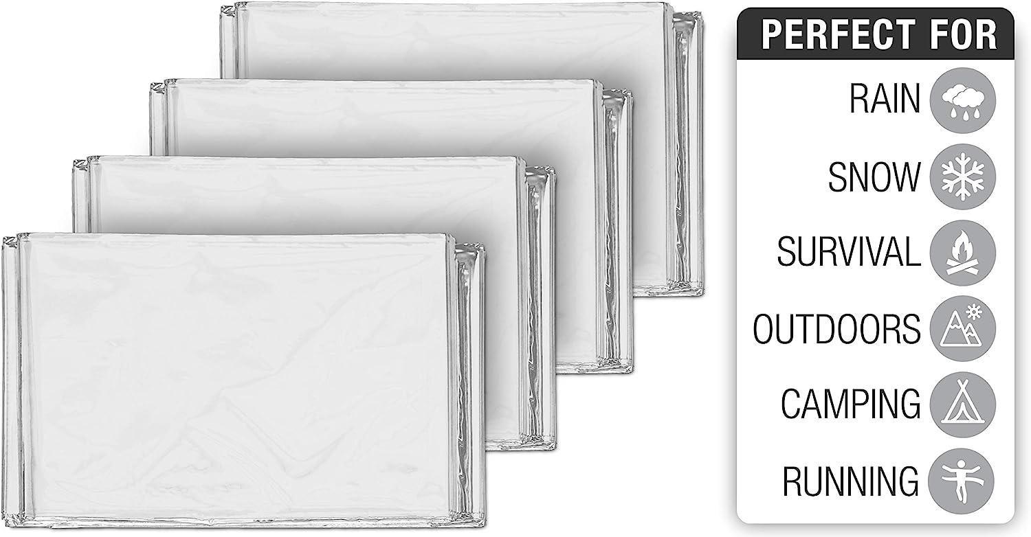 The Swiss Safe Emergency Mylar Thermal Blankets Premium 12-Micron 52" X 82" Silver 10-Pack is an advanced aluminized dual-sided thermal blankets are designed to retain up to 90% of body heat and are perfect for use in emergency survival situations, as well as home & industrial applications. Blankets are waterproof, windproof, and moisture-proof, helping to keep you dry in damp, wet, rainy, and downright cold environments. Perfect for hiking, outdoors, camping, backpacking, climbing. Can be used as ground cover, sleeping bag liner, or to prevent hypothermia and shock in extreme weather conditions.