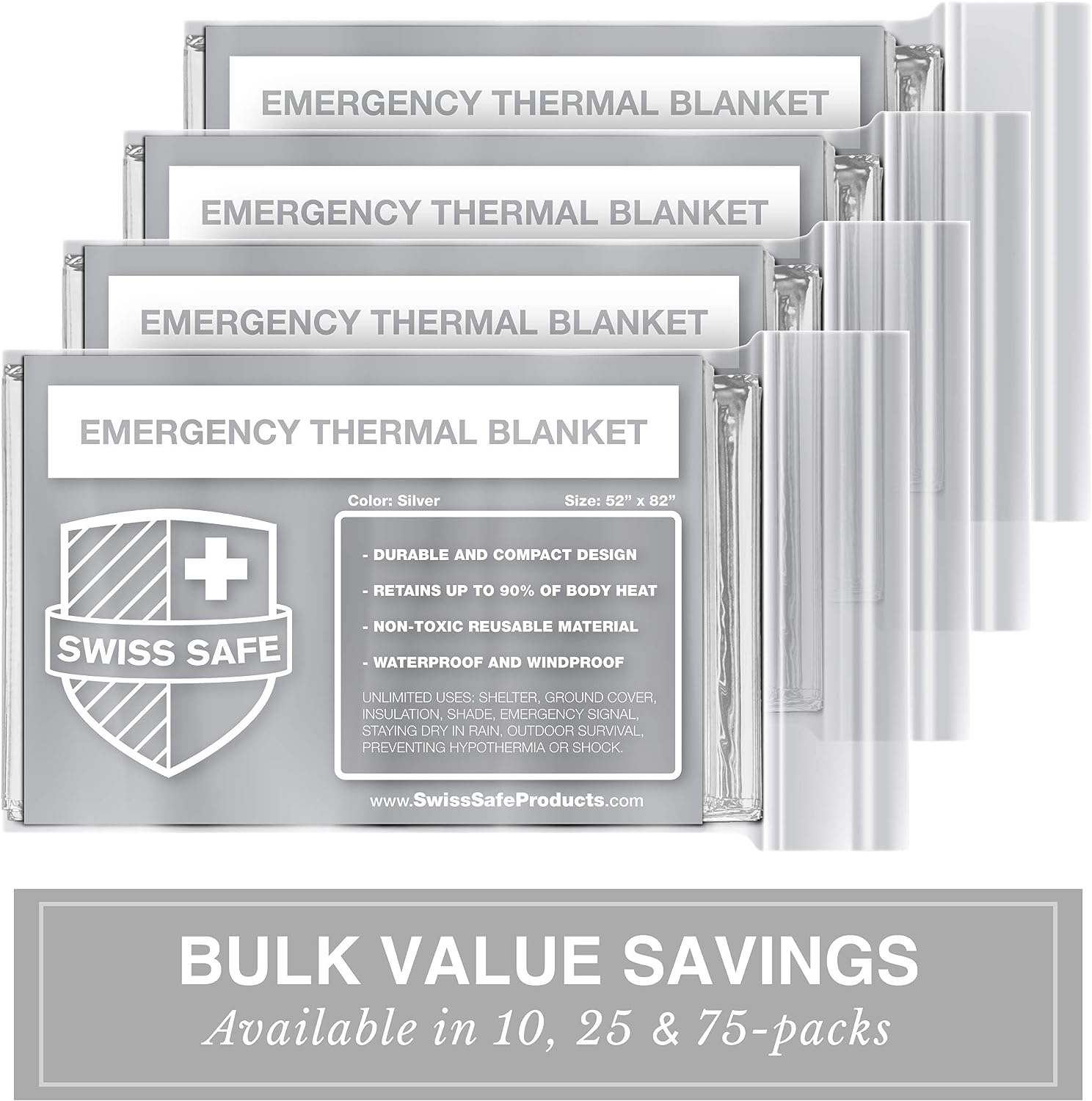 The Swiss Safe Emergency Mylar Thermal Blankets Premium 12-Micron 52" X 82" Silver 10-Pack is an advanced aluminized dual-sided thermal blankets are designed to retain up to 90% of body heat and are perfect for use in emergency survival situations, as well as home & industrial applications. Blankets are waterproof, windproof, and moisture-proof, helping to keep you dry in damp,...