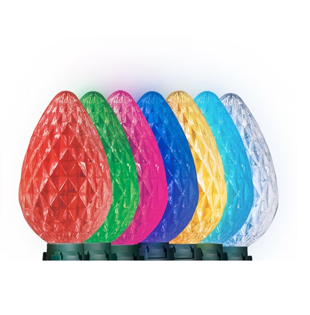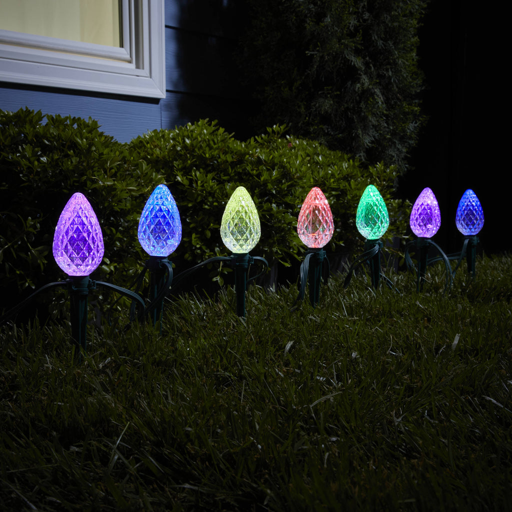 GE Color Effects 8-Count RGB G-60 LED Pathway Lights Multicolor 9.3-FT Set with remote control and stakes. Use remote control to choose between 7 colors, 54 functions and 8 operating modes with SYNC. Green cord with 18-In lead wire, 16-In lamp spacing, 4-In end connector plug, 9.3-Ft lighted length. Assembled height of 14.75-In includes stake. Can connect up to 7...