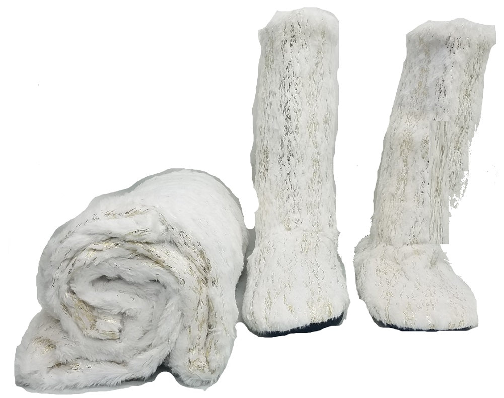 Pair of booties, attractive faux fur design. Get comfortable and show your wild side with the Adrienne Landau Faux Fur Throw and Medium Booties Set, White/Gold. This fun set takes your love of Faux furs and makes bedtime or lounging around a lazy Sunday afternoon relaxed and cozy. Let this be your fatal attraction ... the one you can't do...