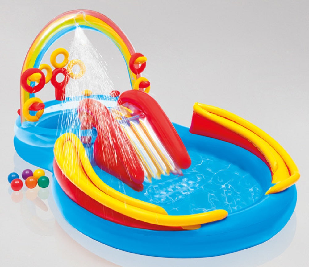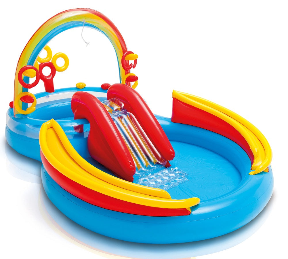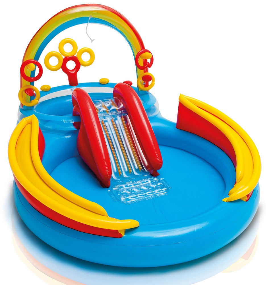 Bring all the fun of the swimming pool to your backyard this summer with the Rainbow Ring Play Center from Intex. Built for a water-splashing good time, this inflatable pool features a small water slide, a wading pool to cool off in, a water sprayer and a ring-toss game. Make the most of this summer with the Rainbow Ring Play...