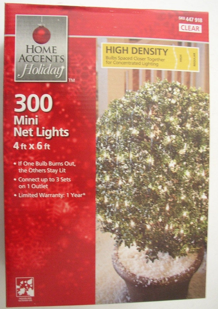 The Home Accents Holiday 300-Mini Net Lights High Density Clear Lights 4' x 6' is perfect for your shrubs or tree. These mini lights feature High Density Bulbs spaced closer together for concentrated lighting. Product Details: 300 Mini Lights. Clear. 4' x 6' area (24 sq ft). If one bulb burns out, the others stay lit. Connect up to 3...