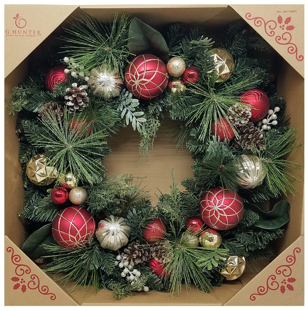 Decorate for the holiday season with the beautiful CG Hunter Holiday 30" Wreath Decorated with Pine Cones, Ornament & Greenery. The glimmering gold and greenery accents make this wreath dazzle with beauty. Brilliantly enchanting, this wreath is inspired by the essential elements of a memorable Christmas. A fuller look can be achieved by gently moving and arranging the branches and...