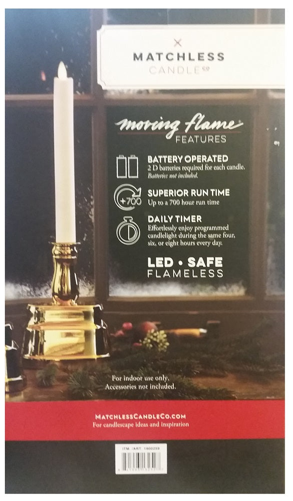 Moving flame features Matchless Flameless Window Candles 15" Battery Operated 2-Pack is the safe way to light a flame without having to worry about the flame. This moving flame is battery operated. It has a superior run time, up to 700 hour run time. It has a daily timer. You can effortlessly program candlelight during the same four, six, or...