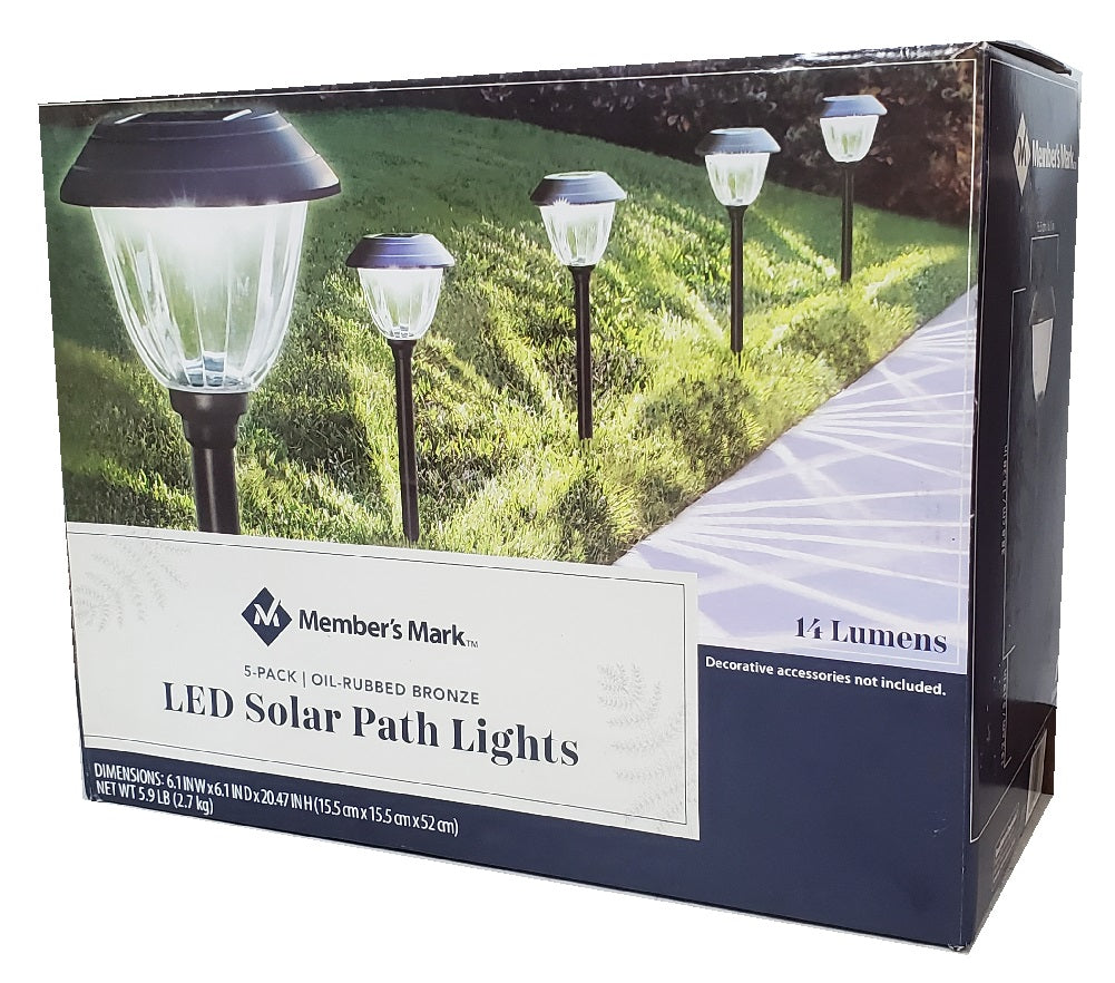 Enjoy Member's Mark 5-Pack Oil-Rubbed Bronze LED Solar Path Lights 6in D x 20.5in H quality outdoor lighting powered by the sun while saving energy and money. Powered by high-quality solar cells that deliver more energy to operate lights longer. These lights are crafted with durable steel, and come in a beautiful oil-rubbed bronze finish. The glass lens refracts an...