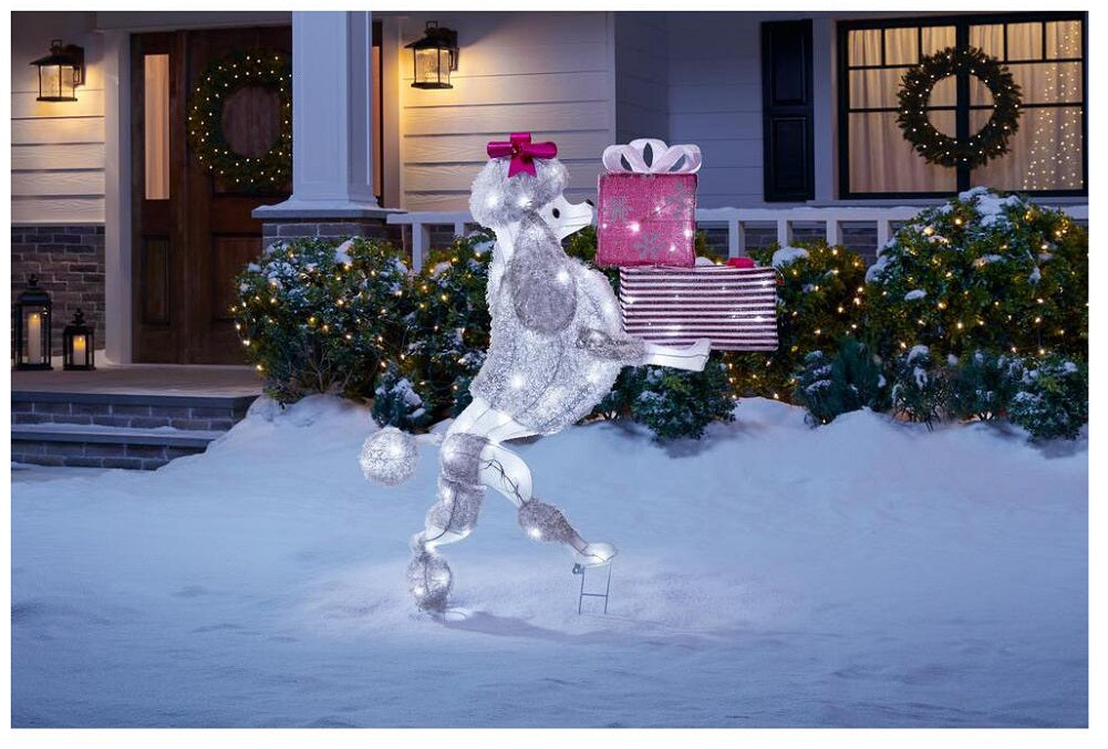 Add an adorable touch to your holiday decorations with this Home Accents Holiday 42 inch Christmas Cool White LED Poodle with Presents. The metal frame is covered in pink tinsel and lit with the cool glow of 80 LED lights. Wearing cute pink clothes and holding two wrapped gifts, this poodle is perfect for your porch or entryway. Rated for...