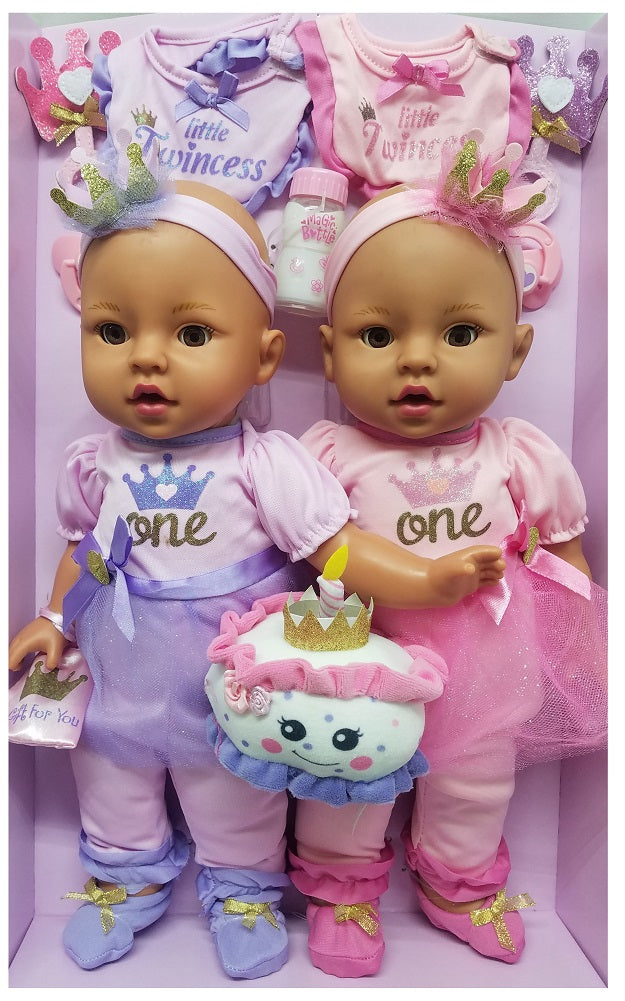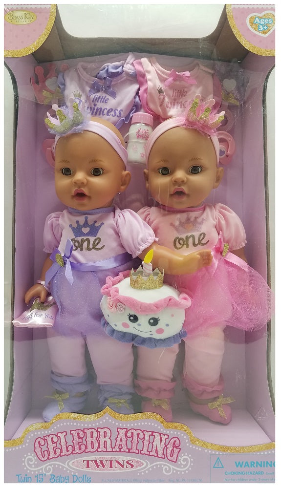 Brass Key Keepsakes Celebrating Twins 15" Little Twincess Twins with Brown Eyes, turn ONE!! These adorable twins are celebrating their very first birthday together! Care for your precious baby girls and help them celebrate this joyous occasion with their nurturing accessories that include rattles, bibs, pacifiers and a magic milk bottle. The special plush birthday cake along with their sweet...
