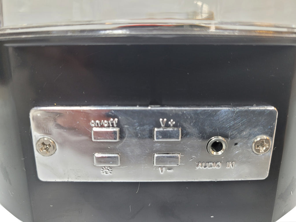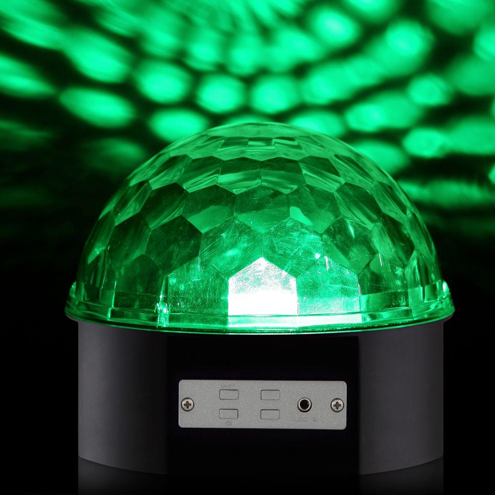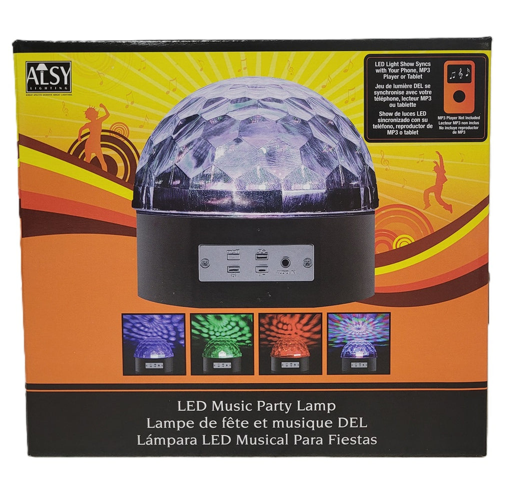 The Super LED party light is a party in a box! This party light is sound activated with a a strobe effect, adjustable speed control and is compatible with most MP3 players. Choose between three colors: Red, green and blue LED. Dual speakers for optimal sound effect. LED light show syncs with your music. Dome measures 7.13" diameter. On/Off switch...