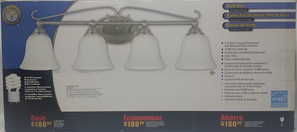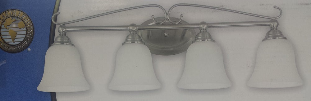 The Good Earth Lighting Bath Bar Vanity Light, Brushed Nickel, offers a 4-light bath bar features a beautiful brushed nickel finish that is perfect for home or office bathrooms. Product Details: Brushed Nickel FInish with White Glass Diffuser. Dimensions: 30" x 9.625" x 7.25". Four 13-Watt Compact Fluorescent Self-Ballasted Bulbs (Included). 10,000 Hour Bulb Life. Quality Glass and Metal Construction....