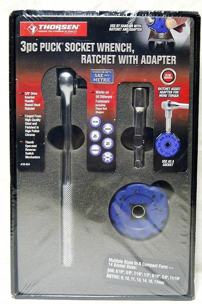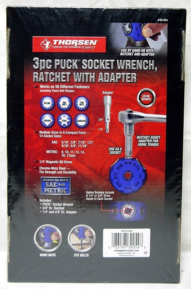 The Thorsen 3-Piece Puck Socket Wrench, Ratchet with Adapter 39-054 is a multi-purpose tool that will add versatility to your toolbox. It combines the structure of a ratchet and wrench extension, allowing you to perform standard wrench action and movements, as well as close-quarter jobs. The streamlined socket set is made of steel and plastic with a blue finish. It...