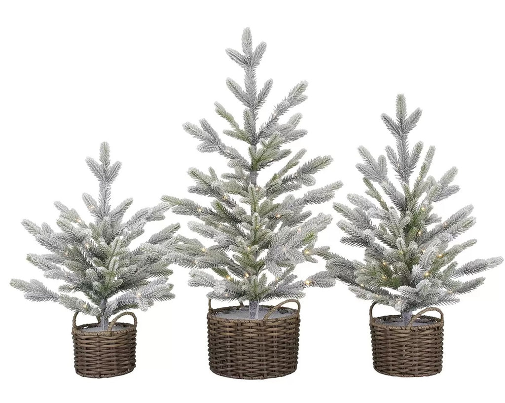 Light up your home this Christmas season with this 3 piece flocked tree set in beautiful woven vinyl baskets. Suitable for indoor or outdoor use, this set is illuminated with twinkling LED lights for a festive look. Each tree is battery operated, providing you with ultimate decorating flexibility and a timer function that allows the lights to turn on at...