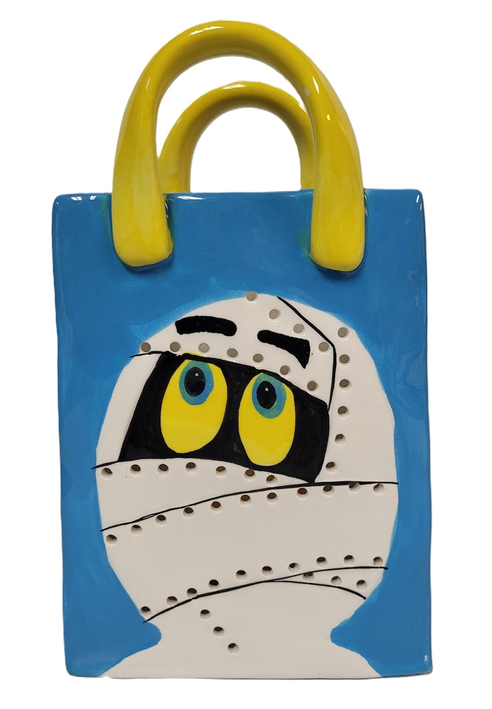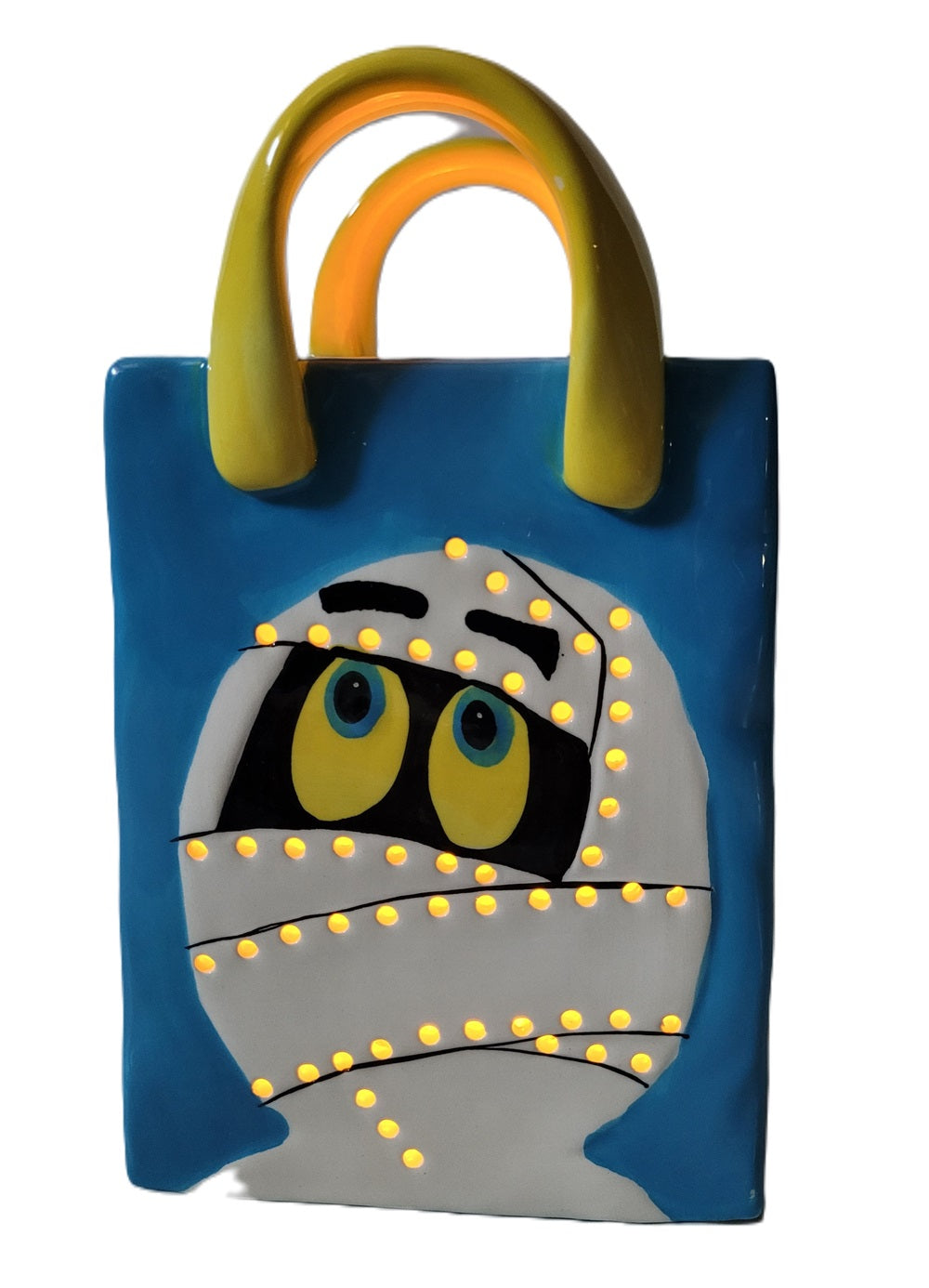Mr. Halloween Illuminated Ceramic Mummy Candy Bag with 4-Hour Timer! Trick or Treat! Add some spooky fun to your home this Halloween with this cute decoration. It's battery-operated so you can place anywhere and it features a 4-hour timer, so you can set it and forget it. Perfect for any room Halloween decoration. Battery-operated with two AA batteries, NOT included....