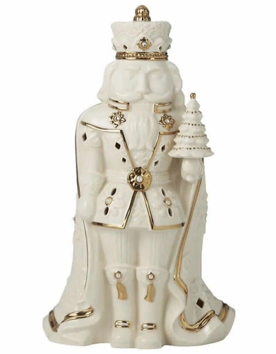 Decorate your home for a traditional holiday with this noble Florentine & Pearl nutcracker figurine featuring elegant craftsmanship and classic Christmas elements. Made from beautiful ivory porcelain that is hand-decorated with clear glass gems, faux pearls and accents of 24K gold. Lights up night with its warm glow using a 6-hour timer with a switch conveniently hidden inside the base....