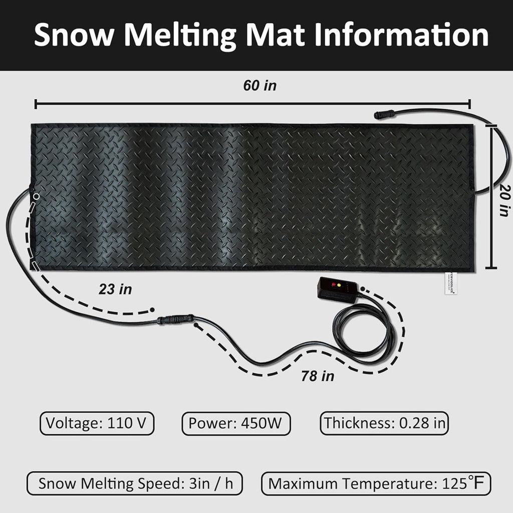 The Olife snow melting mat is made from durable, high-quality PVC material and measures 20X60 inches. It is built to withstand even the harshest winter storms and can be used throughout the entire season, whether on your driveway, walkway or steps. Snow melting outdoor mats, designed for snow and ice removal, features a graphene heating element with copper wire conduction....