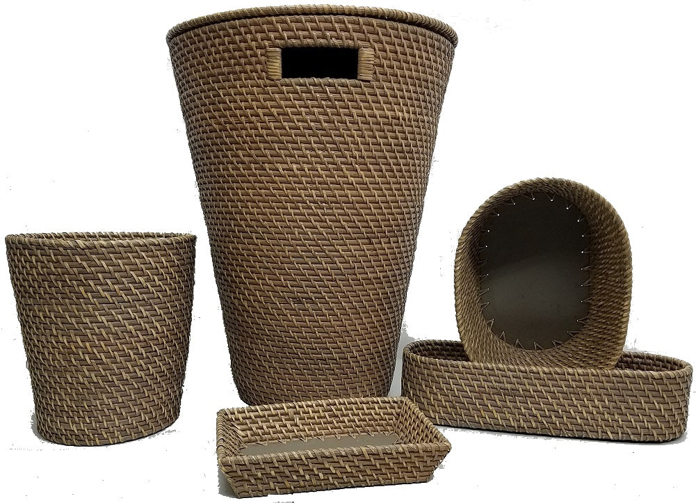Complete the look of your bathroom with the 5-Piece Hapao Rattan Hamper Set. This coordinated set includes a tapered hamper with lid, round tapered wastebasket, oval tank tray, oval vanity tray and guest towel holder. Product Details:5-Piece Hapao Rattan Hamper Set, Gray: Coordinated set. Includes tapered hamper with lid, round tapered wastebasket, oval tank tray, oval vanity tray and guest...