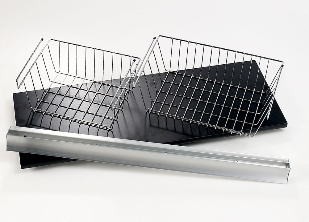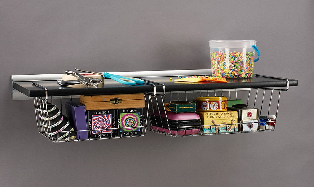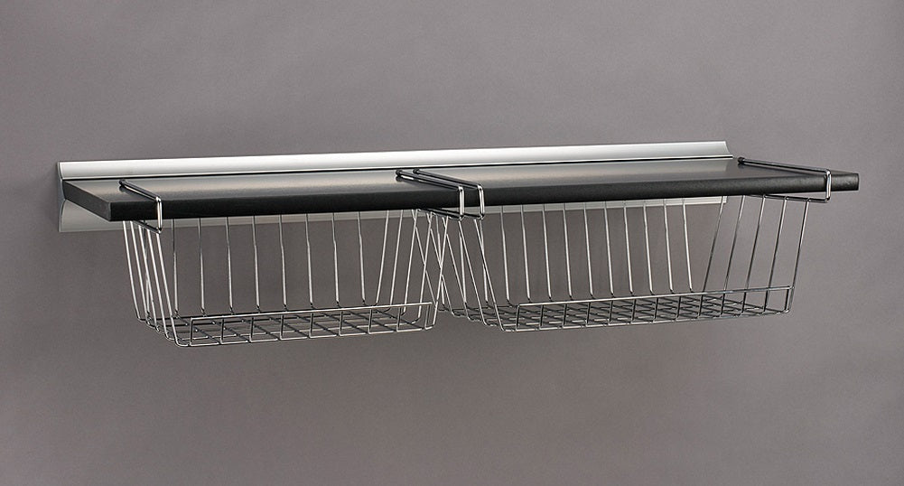 Have more storage space with the Wallscapes Gallery 12" x 32" Black Shelf, Silver Bracket with 2 Basket Set. This set includes one shelf, one small basket and one medium basket. Designed to hang under a shelf, each container can hold up to 6 lbs. The under shelf basket and medium basket set is a good option for storing accessories...