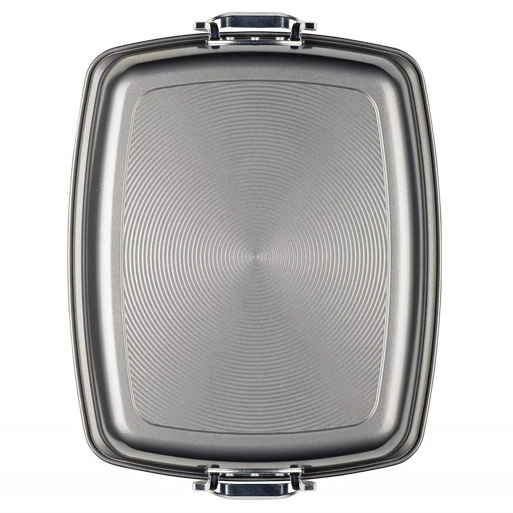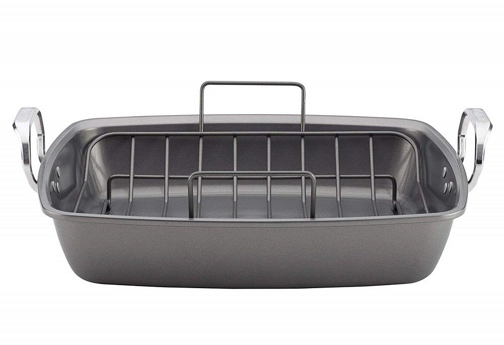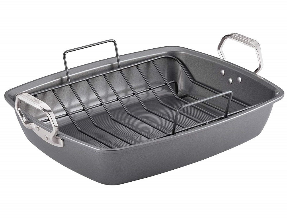 The Circulon Premier Professional Roaster and Rack 18" x 15" has a high-low circle design with premium nonstick reduces abrasion and releases food more than two times longer than ordinary nonstick. Holds up to a 24 pound turkey with room for fixings. Features: Nonstick roaster and rack for easy clean up. Durable steel construction supports up to a 24 pound...