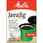 Melitta Coffee & Tea Filters JavaJig Reusable Coffee Filter System is a reuseable coffee filter system for use with most Keurig Inc style and/or single serve coffee brewers. Includes 2 reuseable cups and 30 coffee filters. This product is simple to use and ready in seconds. Save money, use your own favorite coffee or tea. Quick and easy directions included....