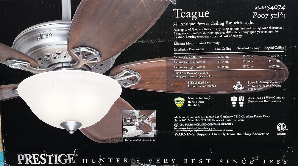 Relaxed yet refined, the Hunter Prestige Teague 54" AntiquePewter Ceiling Fan with Light, will add simple elegance to any room in your home. A modest style made stunning with Blackened Pecan carved wood blades and Antique Pewter finish. The patented Whisper Wind motor delivers ultra-powerful air movement with whisper-quiet performance so you get the cooling power you want without the...