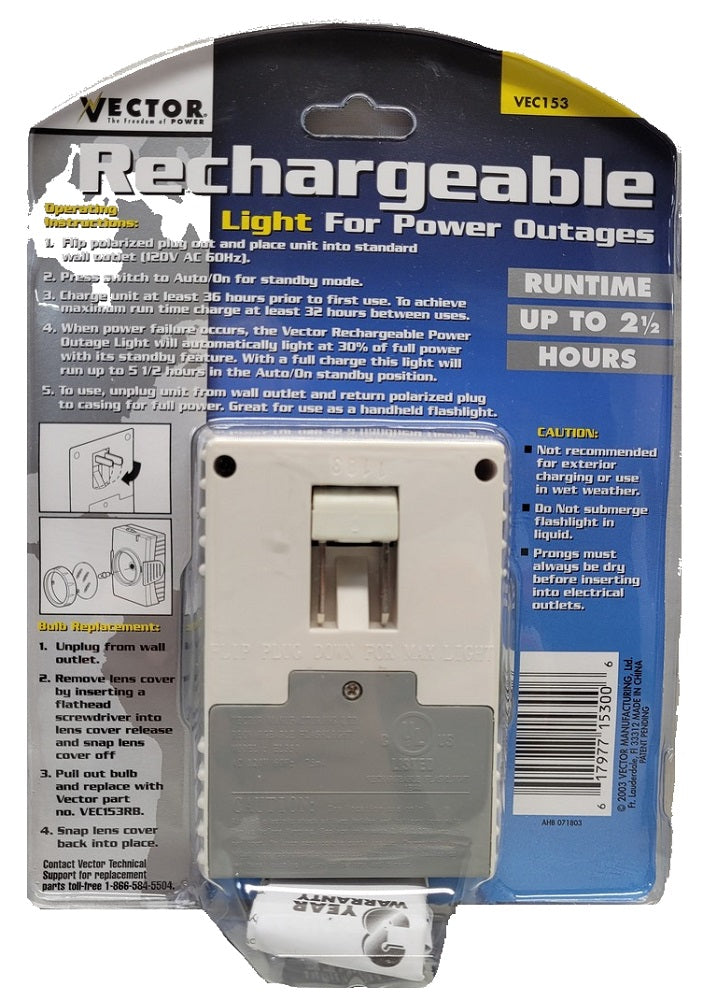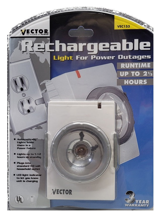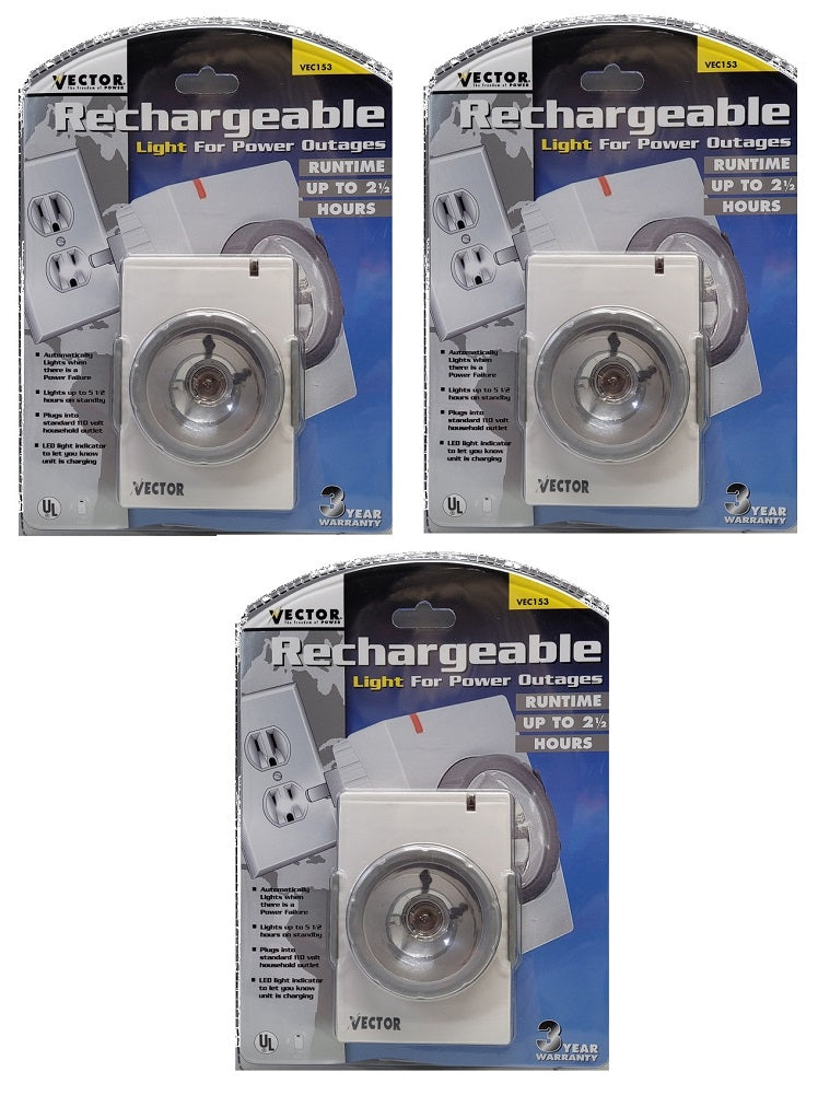 3-pack Vector Rechargeable Light for Power Outages VEC153 perfect for bedrooms, basements, attics, garages, hallways or anyplace you may be when the power goes out. Perfect for kids rooms and elderly people. They will shine for up to 2 1/2 hours when there is a power outages.