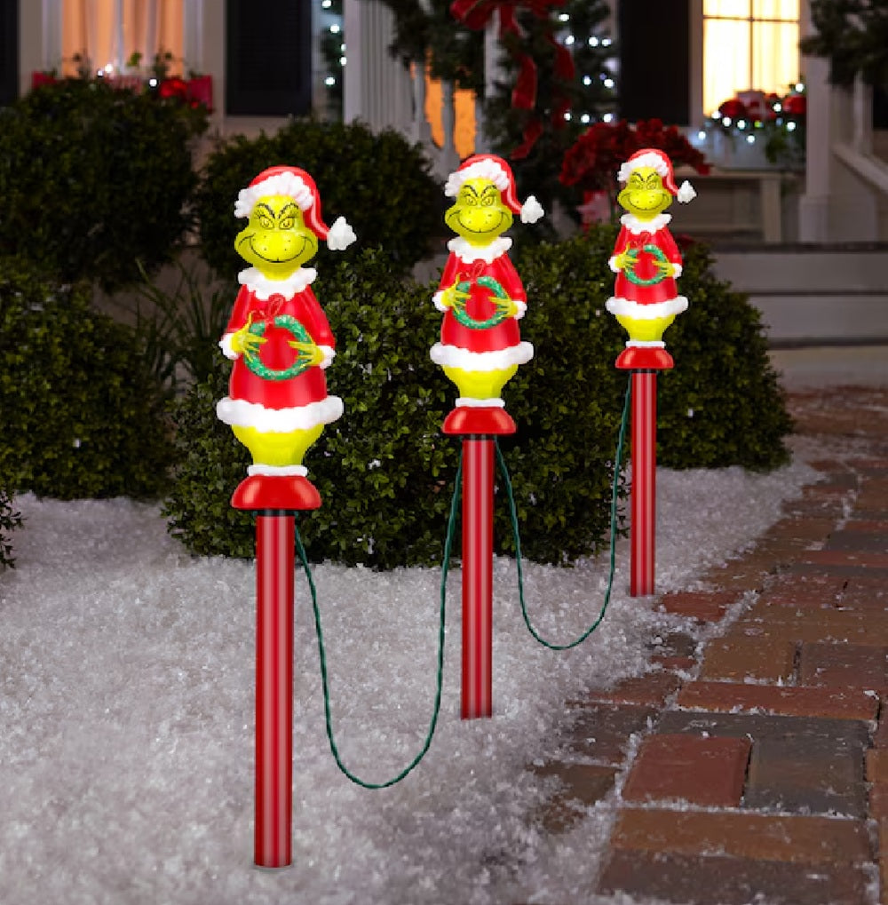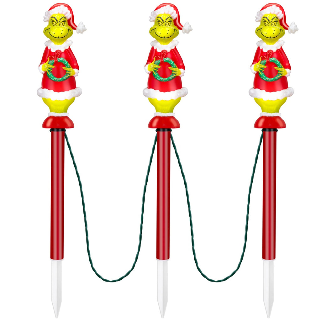 ight up pathways and landscape borders with these charming Grinch pathway stakes! This set of three stakes features 3D Grinch figures styled with Santa suits and wreaths. The set lights up in unison with bright white LED light. Place these Grinch pathway stakes anywhere you enjoy Christmas lights. Includes everything needed for easy outdoor setup. Features Outdoor LED 3D Grinch...