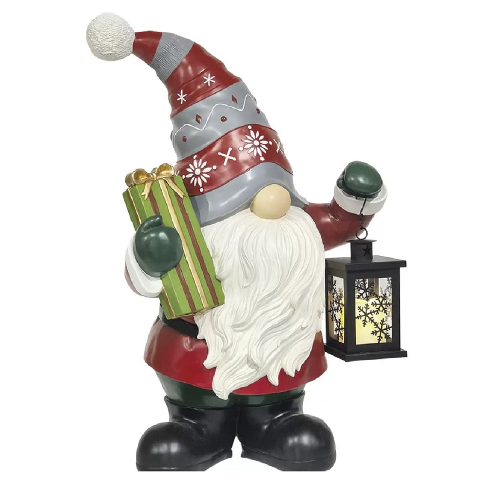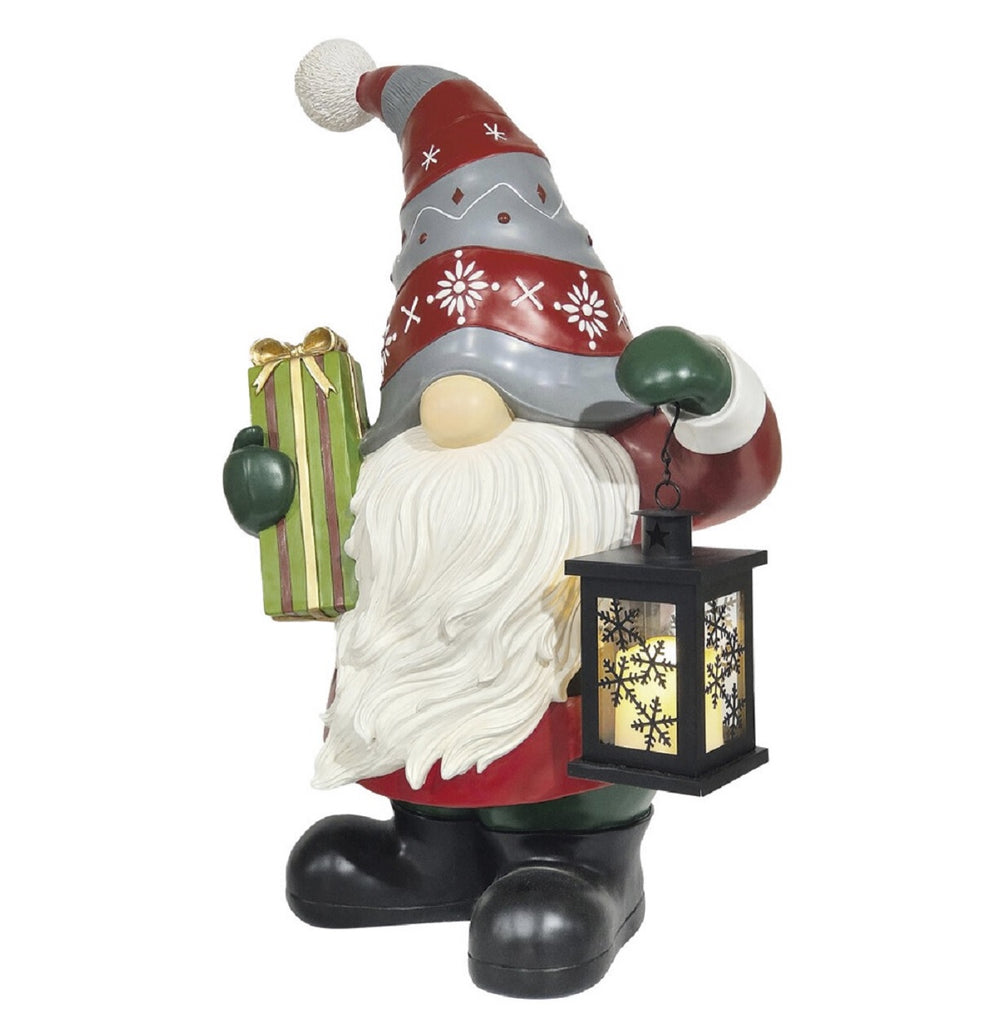 The whimsical gnome is holding a present and a LED lit lantern. It is a great way to help greet guests. The design is hand crafted, hand sculpted and finished with hand applied paint. This handwork gives each piece uniqueness and style. It is a great addition to your holiday decor and will bring joy and warmth wherever it sits...