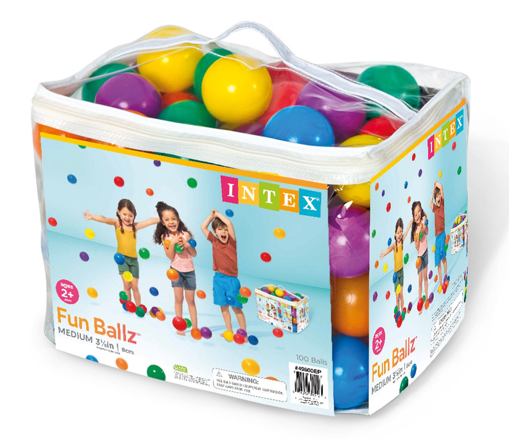 Great for play centers, pools, ball pits, and so much more, the Intex Medium Fun Ballz is a 100 pack bag full of fun! These 3 1/8 inch air filled ball pit balls come in 6 bright colors including red, yellow, blue, orange, green, and purple. The package also includes a carry bag which is great for storing and transporting...