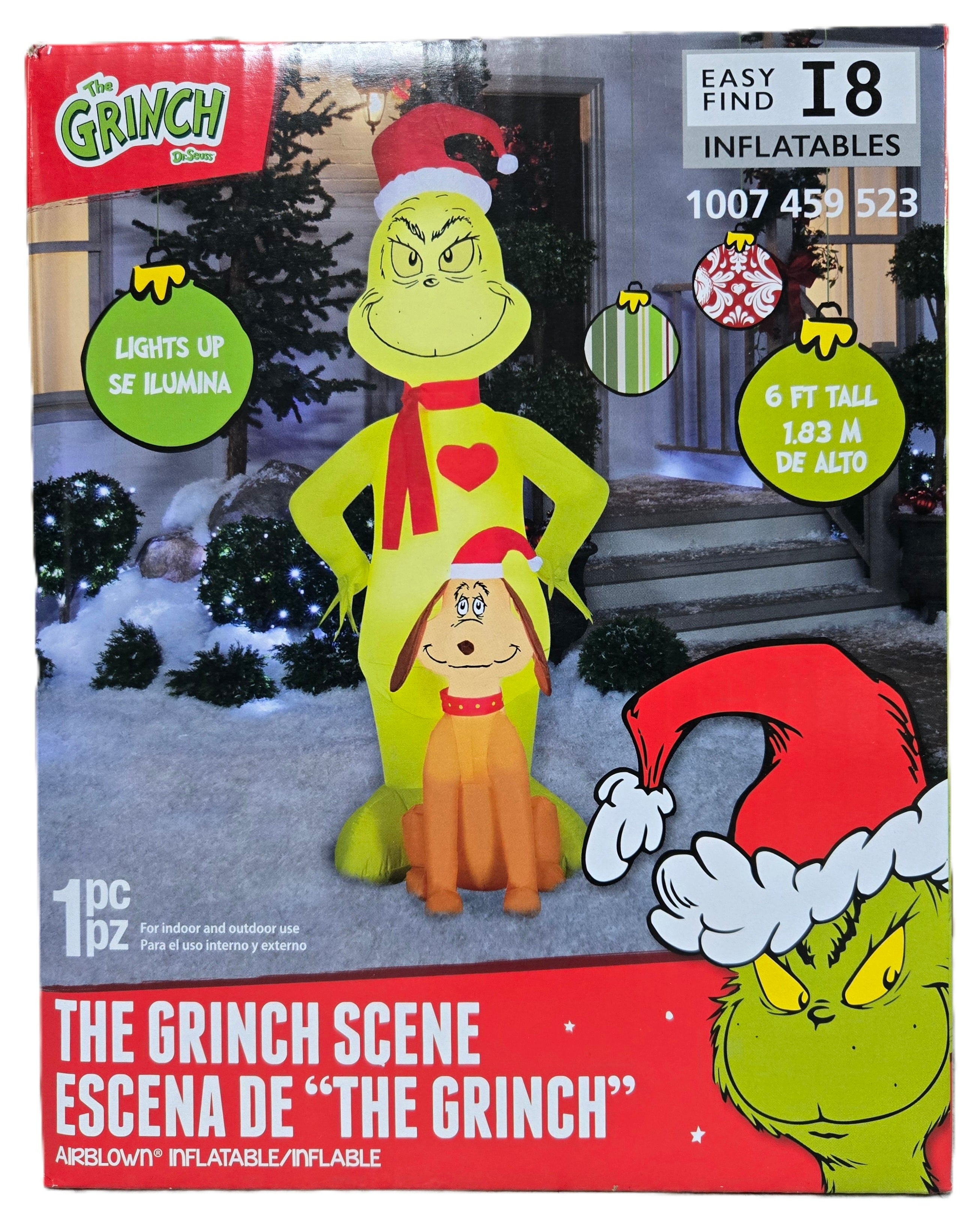 Create a fun, memorable holiday scene in your home or yard with this 6 ft. LED Grinch with Max AirBlown® inflatable from Dr. Suess. The vibrant LED lights illuminates the Grinch with a festive glow, bringing the classic character to life. The self-inflating design with stakes and tethers included allows effortless setup. Activate the integrated LED lights by plugging the power cord into the nearest outlet to ensure safe and hassle-free operation. Display this Grinch as a standalone or combine it with other licensed inflatables this Christmas season.