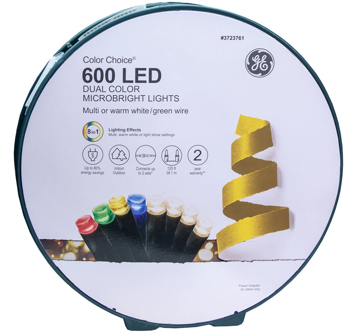 GE Color Choice LED MicroBright 600-count (2 sets of 300 lights each) color changing light set on storage reel. Use the control box to choose between multicolor, warm white, or light show settings. 36-Inch lead wire, 2.5-inch lamp spacing, 4-inch coaxial end connector, 125-feet lighted length, and green cord set. Features: GE LED MicroBright color changing Christmas string lights on...