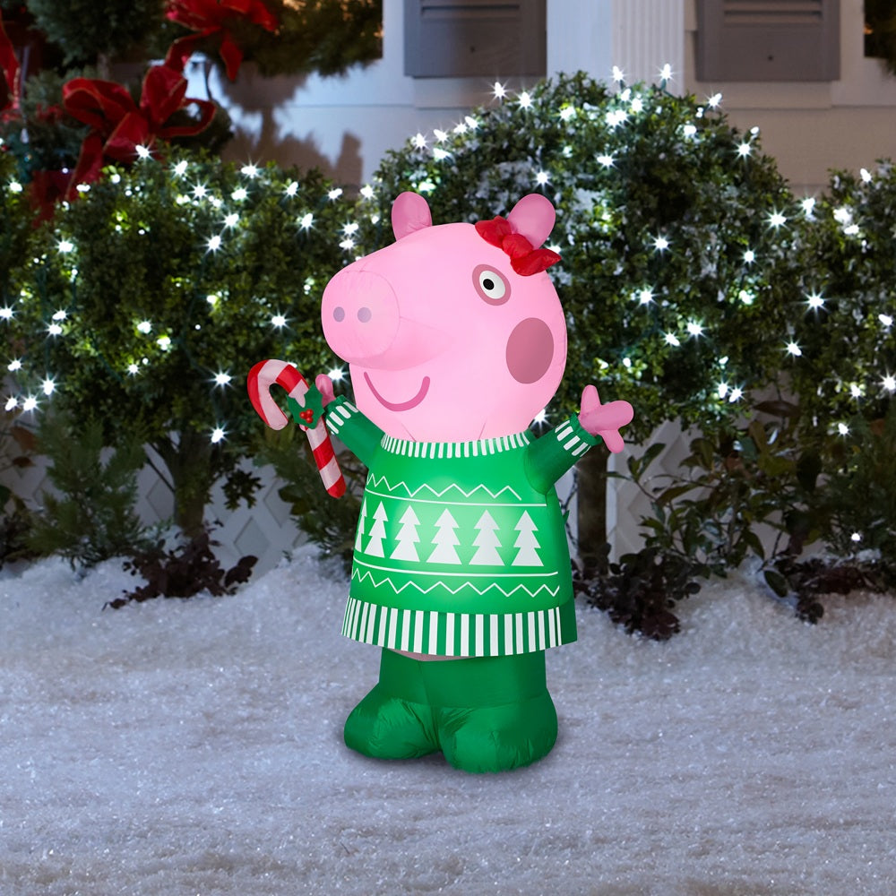 Fans of Peppa Pig will love this colorful Inflatable Peppa! Decked out for the season in an adorable green dress with Christmas tree accents and matching green shoes, our Peppa Pig Christmas inflatable wears a red hair bow and holds a candy cane. Set up is a snap for the easiest decorating ever. Just plug it in, stake it down...