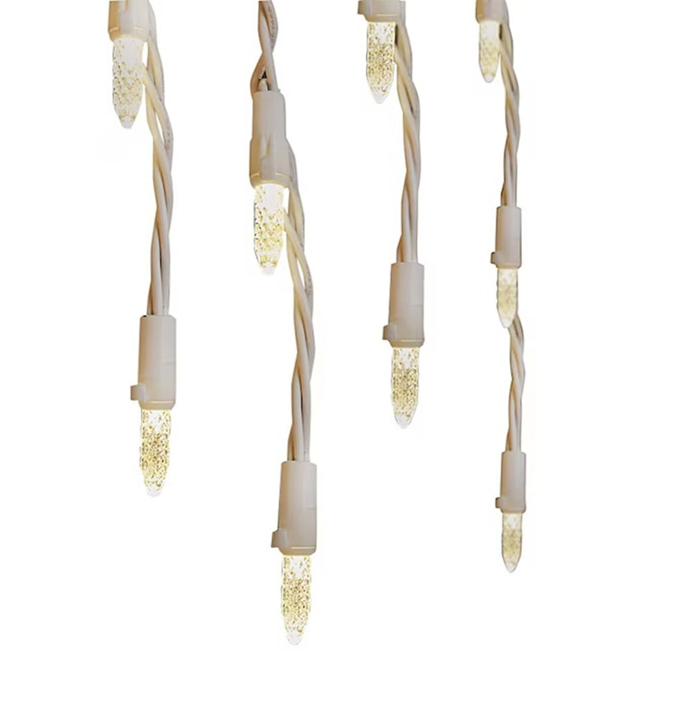 GE Energy Smart ConstantON LED 7-mm diamond cut 150-count warm white icicle lights. 6-Inch lead wire, 3.5-inch lamp spacing, 6-inch strand spacing, 6-inch end connector plug, 14.5-feet lighted length, and white cord set with fused plug. GE 7-mm LED diamond cut Christmas icicle lights features 150-Count, warm white ConstantON LED lights continue to operate even if a bulb is burned...