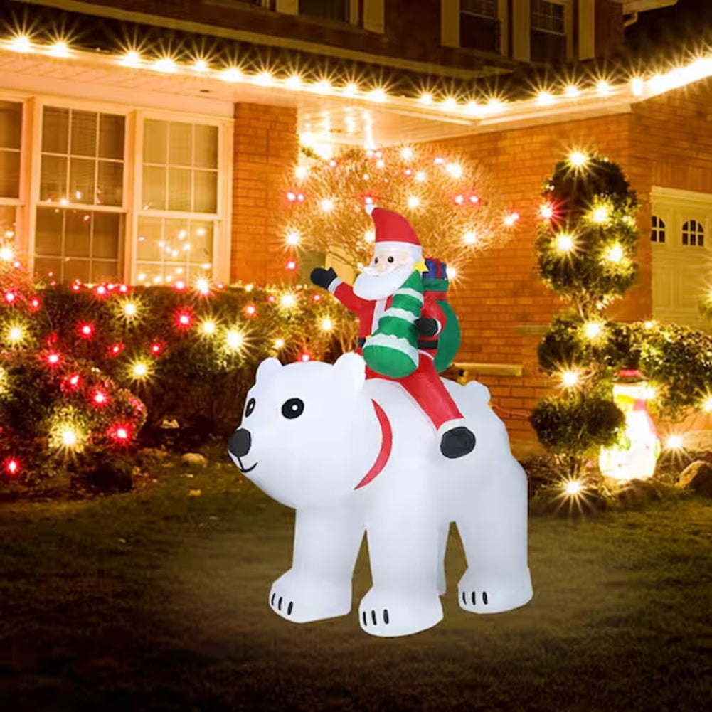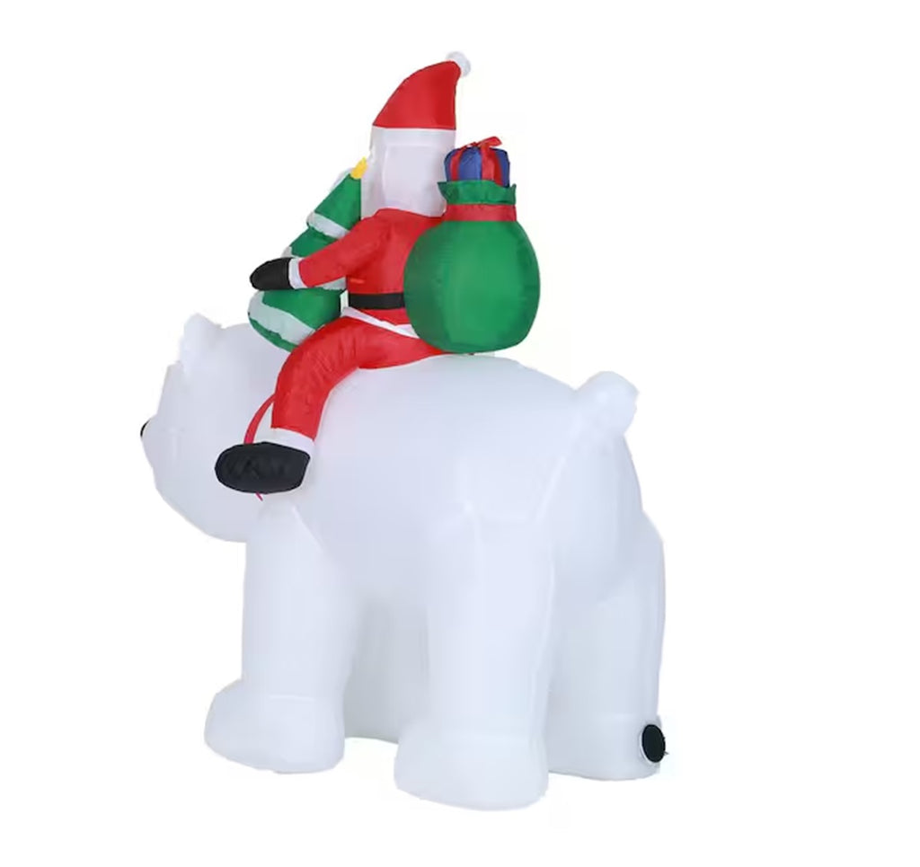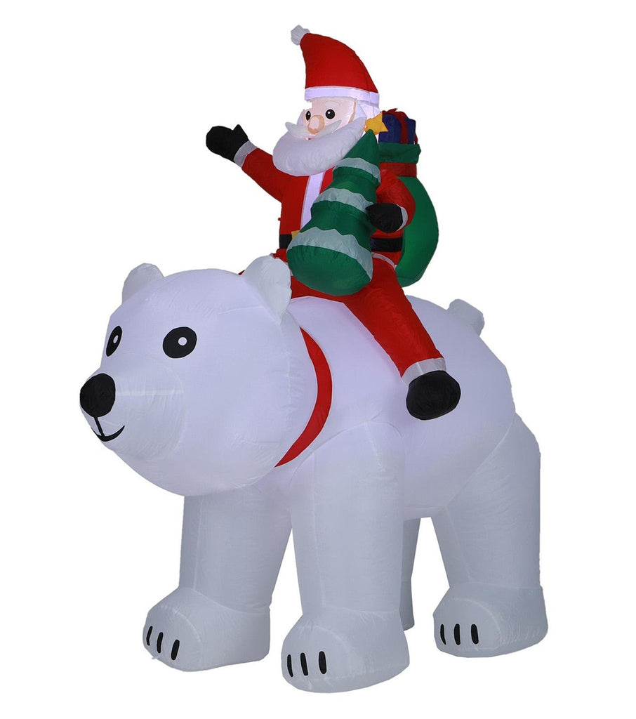 Ho, ho, ho, this 6 ft. tall Santa Claus inflatable will command lots of attention on any holiday yard display. The cheery Santa is featured holding a Christmas tree with his pack of presents on his back, and is sitting on an adorable polar bear. This Santa and polar bear inflatable is weather resistant, and includes LED light up feature....