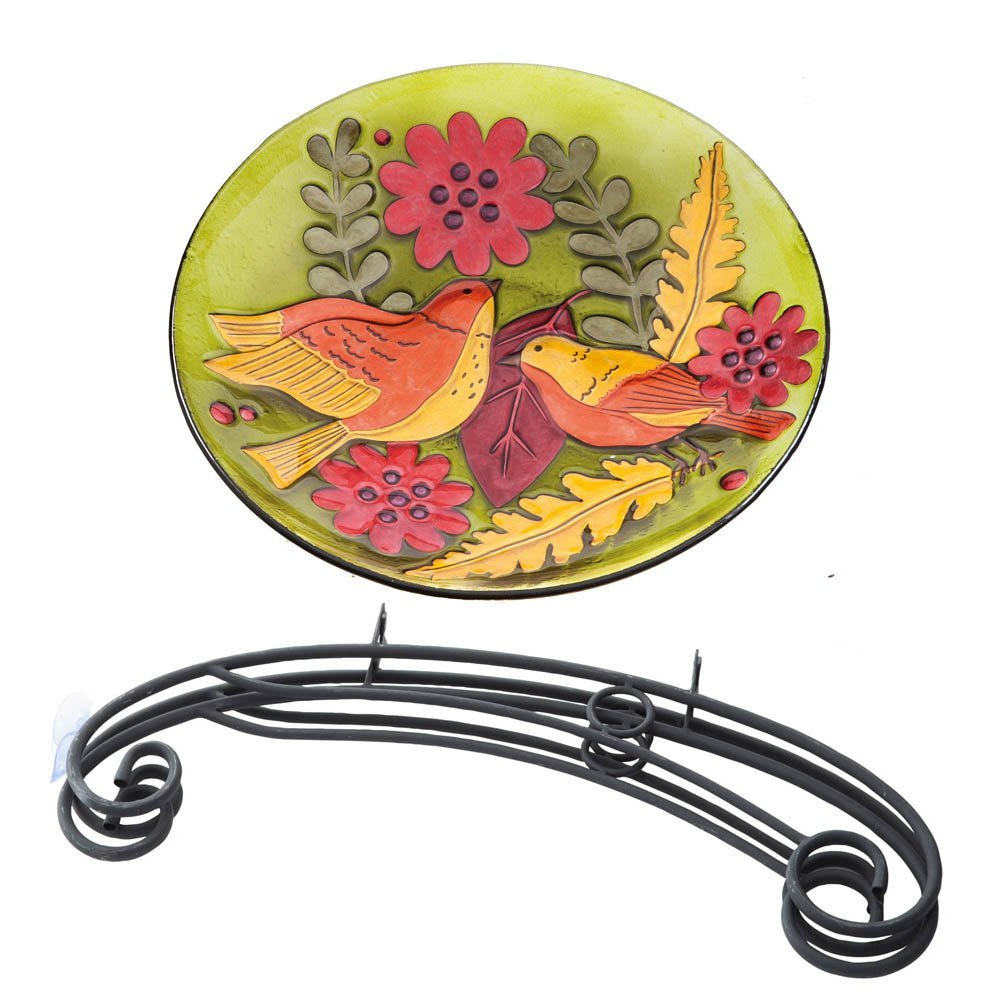 The Aviary Menagerie Glass Birdbath with Stand is a beautiful 16'' glass bowl can be used outdoors as bird bath with or without the included stand or indoors as a bowl or display piece. 2GB238 Product Features: Bird bath dimensions are approximately 16" x 16" x 2". Metal stand dimensions are approximately 23" x 16.5". Includes both the bird bath...
