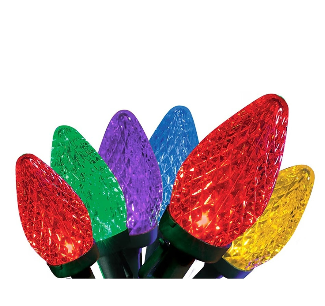 GE Energy Smart 150 LED Faceted C-6 faceted cut 150-count multicolor light set on storage reel. 6-Inch lead wire, 4-inch lamp spacing, 6-inch end connector plug, 49.6-feet lighted length, and green cord set with fused plug. GE C-6 LED Faceted Christmas string lights on a storage reel. 150-Count multicolor LED lights continue to operate even if a bulb is burned...