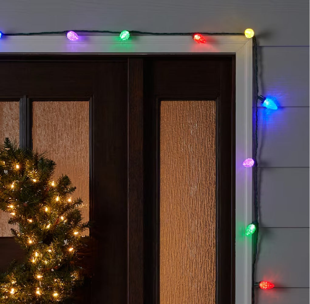 Decorate for the season with the elegant GE Energy Smart LED C9 diamond cut 100-count multicolor light set on storage reel. 6-inch lead wire, 8-inch lamp spacing, 6-inch end connector plug, 66-feet lighted length, and green cord set with fused plug. Can connect up to 25 sets. Replacement bulbs and fuses included for added convenience. For indoor or outdoor use.