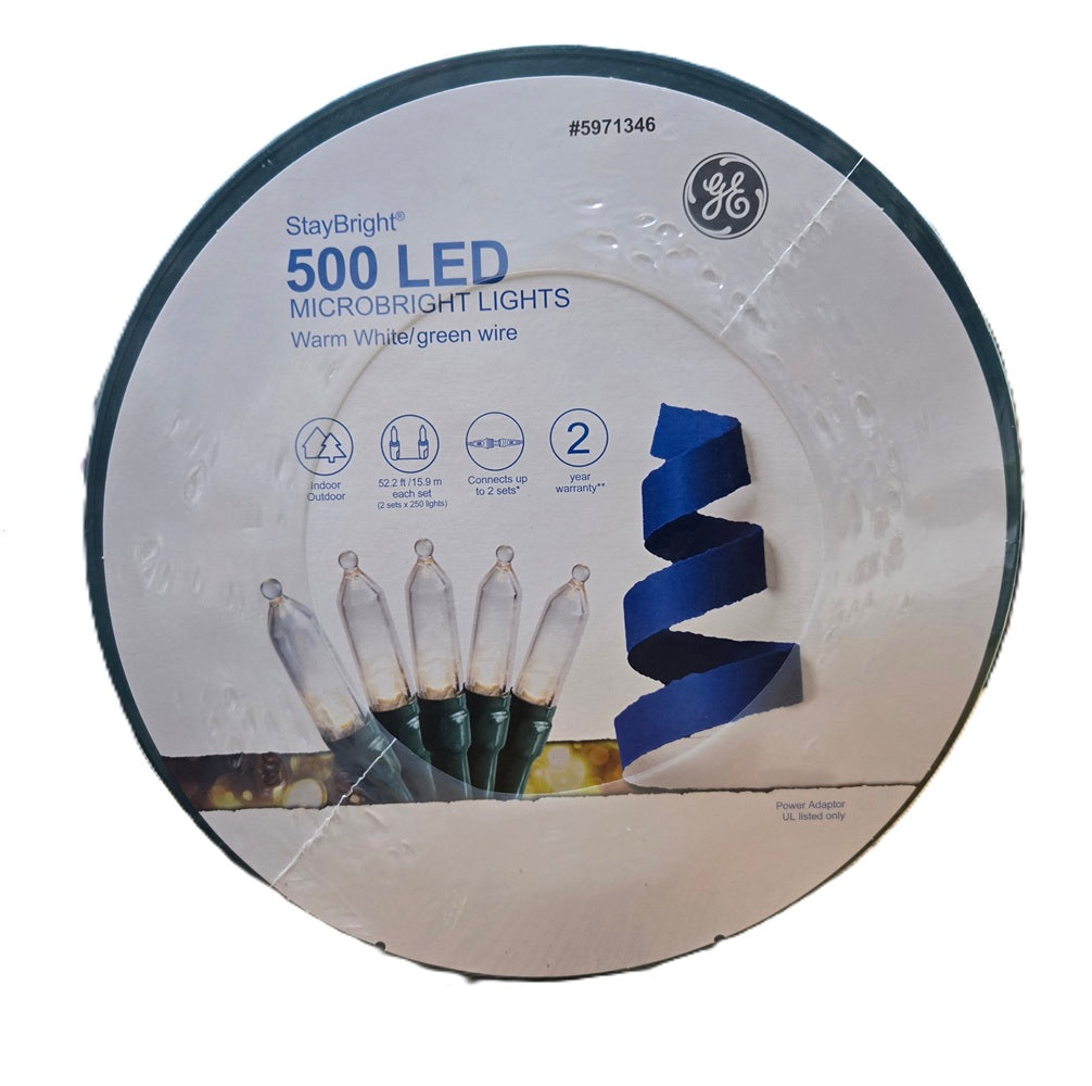 Decorate for the season with the GE MicroBright Multicolor Christmas string lights on a storage reel (2 strands of 250-lights) MicroBright multicolor light set. These lights are perfect to decorate a Christmas tree, decorate a manual, or the exterior of your home. 36-Inch lead wire, 2.5-inch lamp spacing, 4-inch coaxial end connector. 104.4-feet total lighted length, 24 gauge green cord...