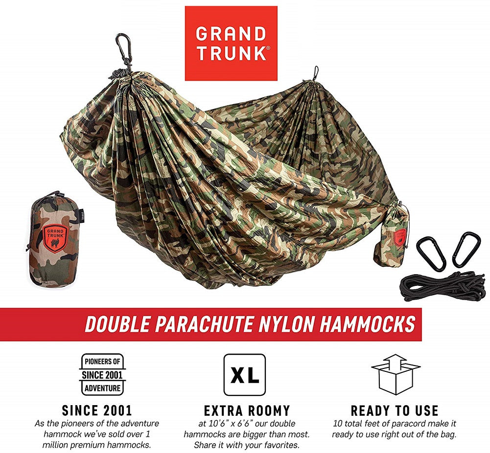 Grand Trunk Hang Anywhere Double Hammock, Woodland Camo, is a super comfortable, parachute nylon hammock is perfect for adventures - from the backyard to the backwoods. Its included stuff sack makes it portable and easy carry around festivals, while hiking or backpacking. Our extra roomy 2 person camping hammock is great for sharing with a friend or spacious for a...