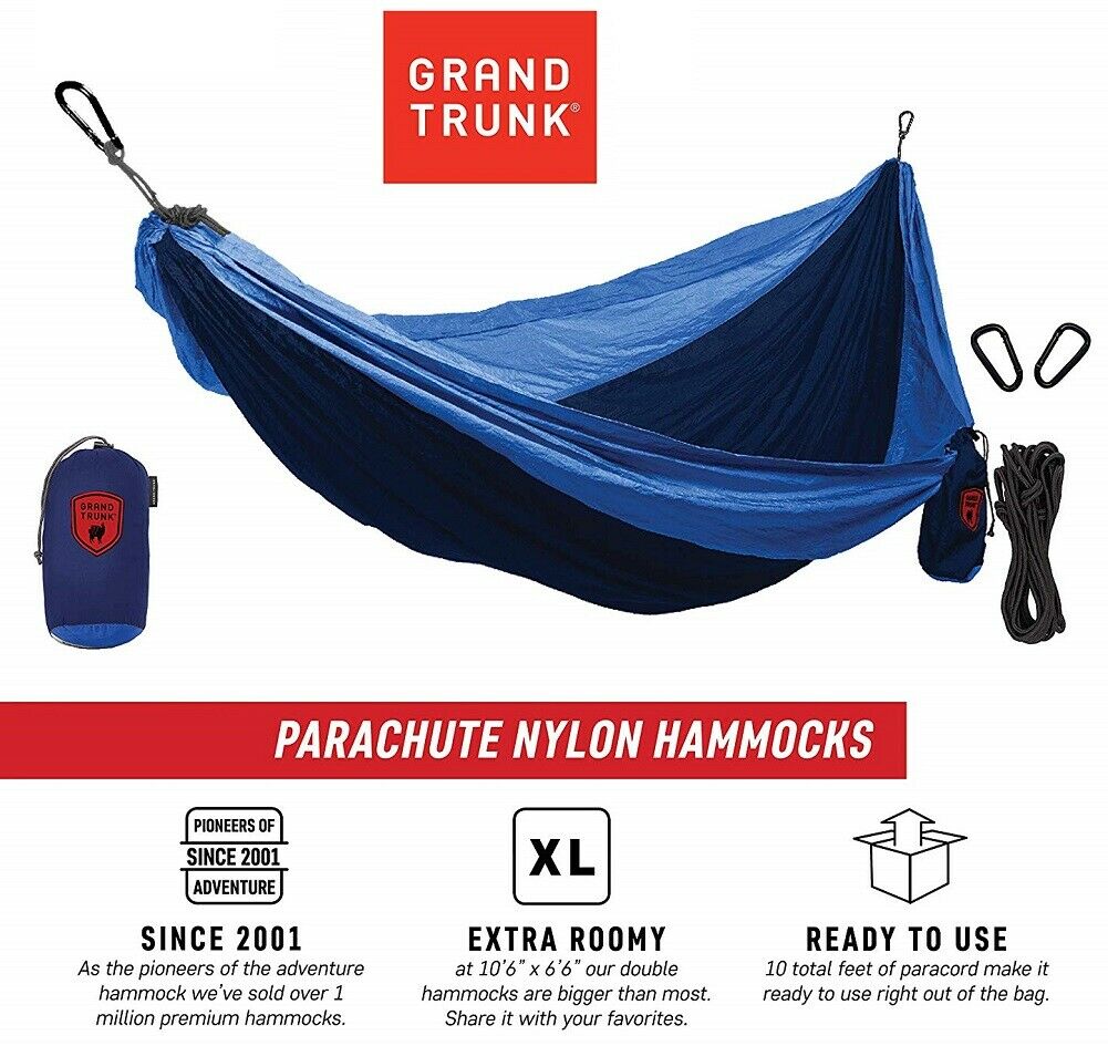 Grand Trunk Hang Anywhere Double Hammock, Navy/Light Blue is a super comfortable, parachute nylon hammock is perfect for adventures - from the backyard to the backwoods. Its included stuff sack makes it portable and easy carry around festivals, while hiking or backpacking. Our extra roomy 2 person camping hammock is great for sharing with a friend or spacious for a...