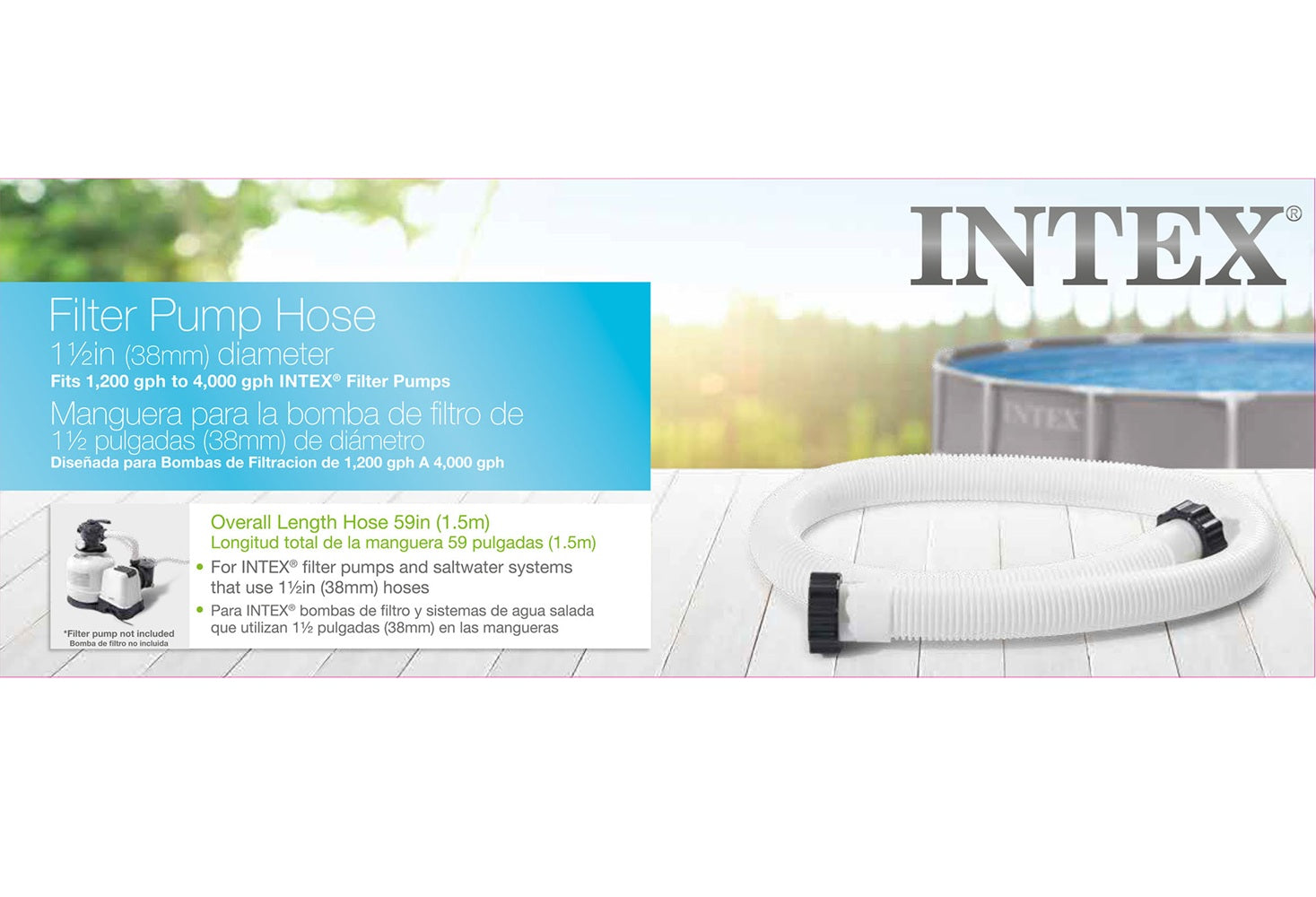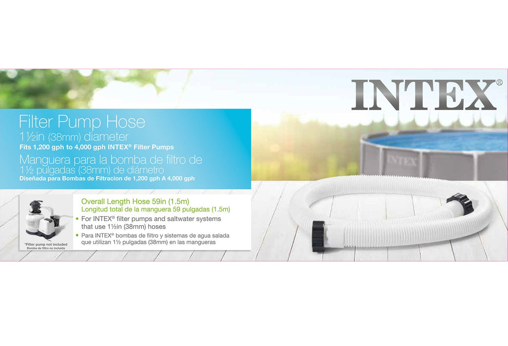This 29060E 1.5-inch Accessory Hose for 1200GPH to 4000GPH Intex Filter Pumps, filter pumps and saltwater systems with the correct size fittings. This accessory hose comes complete with nuts on both ends making installation fast and easy. With a 59" length, this accessory hose provides ample length. This hose is the perfect replacement for your worn out pool hose.