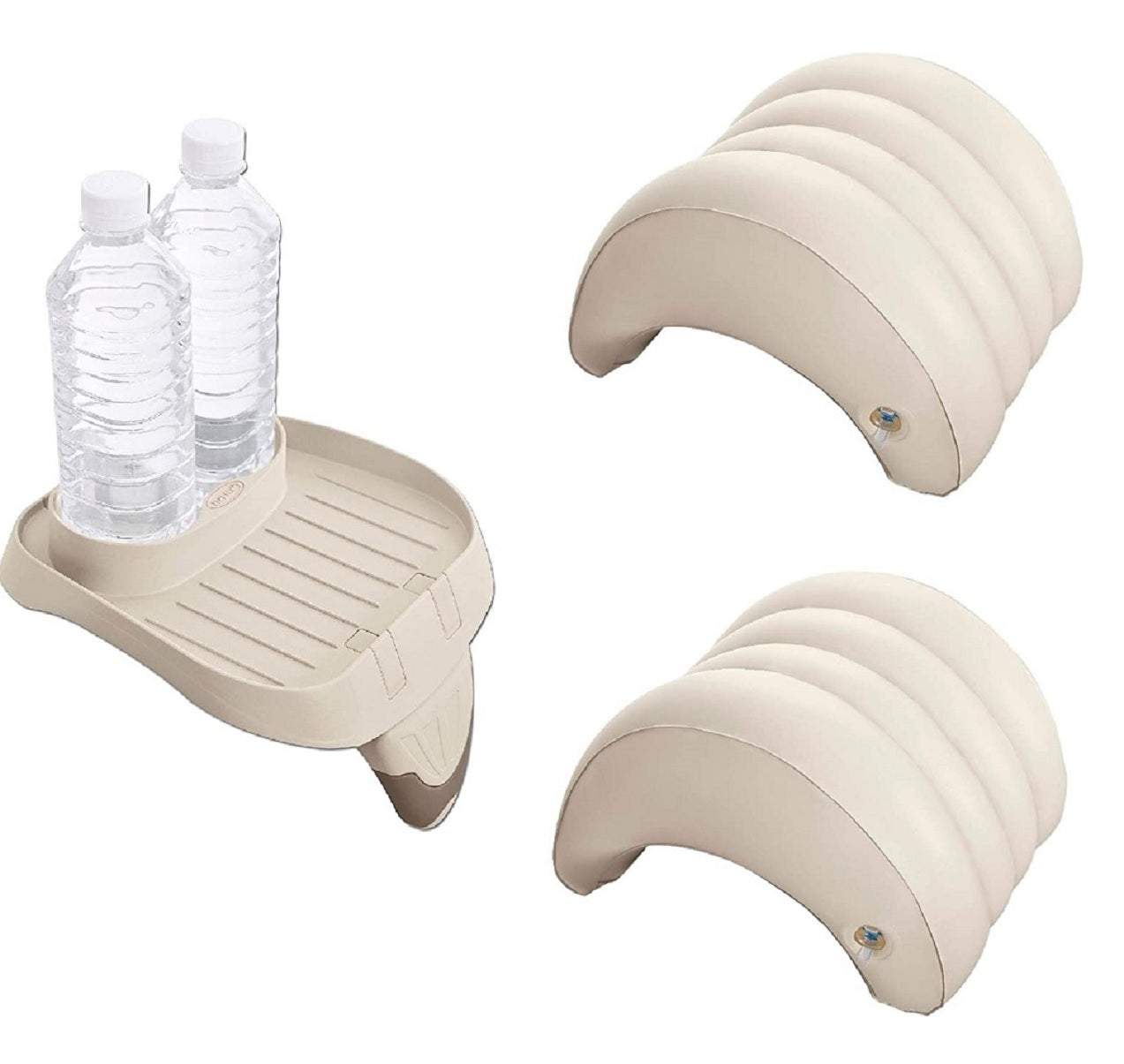Intex PureSpa Bundle 3 Items 1 Cup Holder with Tray and 2 Spa Headrests. The PureSpa cup holder and refreshment tray is designed to securely attach to the spa wall. Keeps beverages and snacks close by while you relax. Removable for convenience. Holds 2 standard size beverage containers. Dimensions: 10.25in L X 8.63in W X 7in H. The convenient spa...